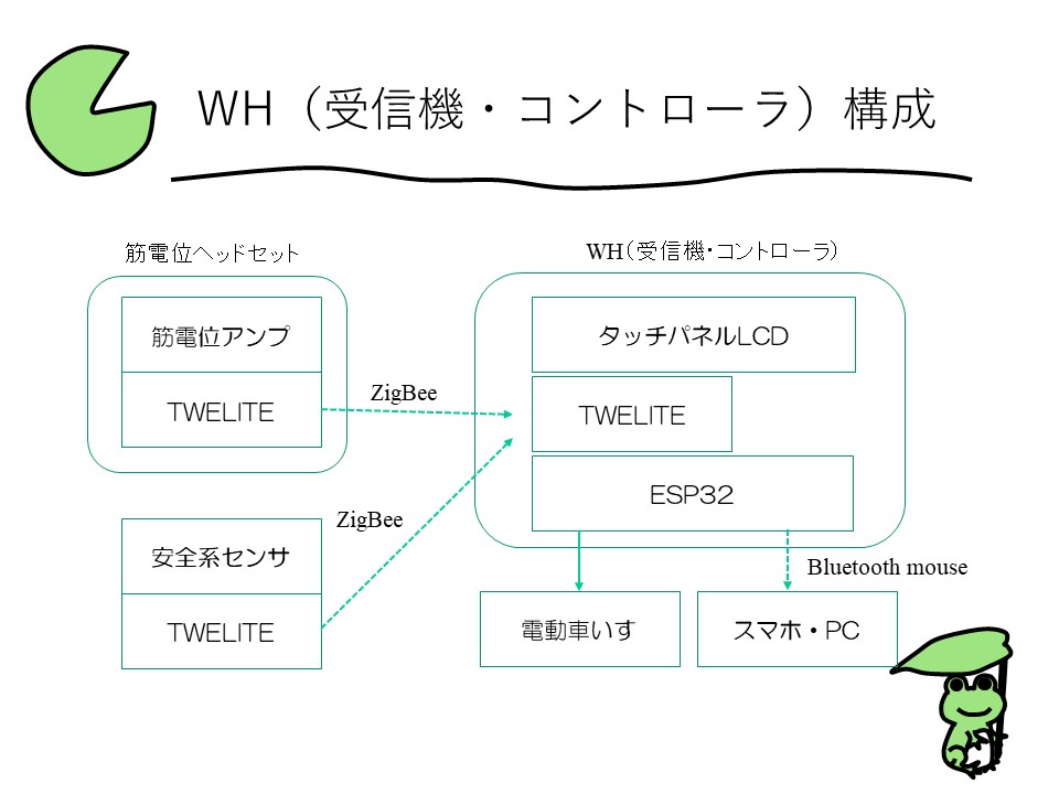 歯の噛みしめによる筋電位電動車いすの操作とBluetooth Moueによるスマホ操作機能を結合しつつあります。