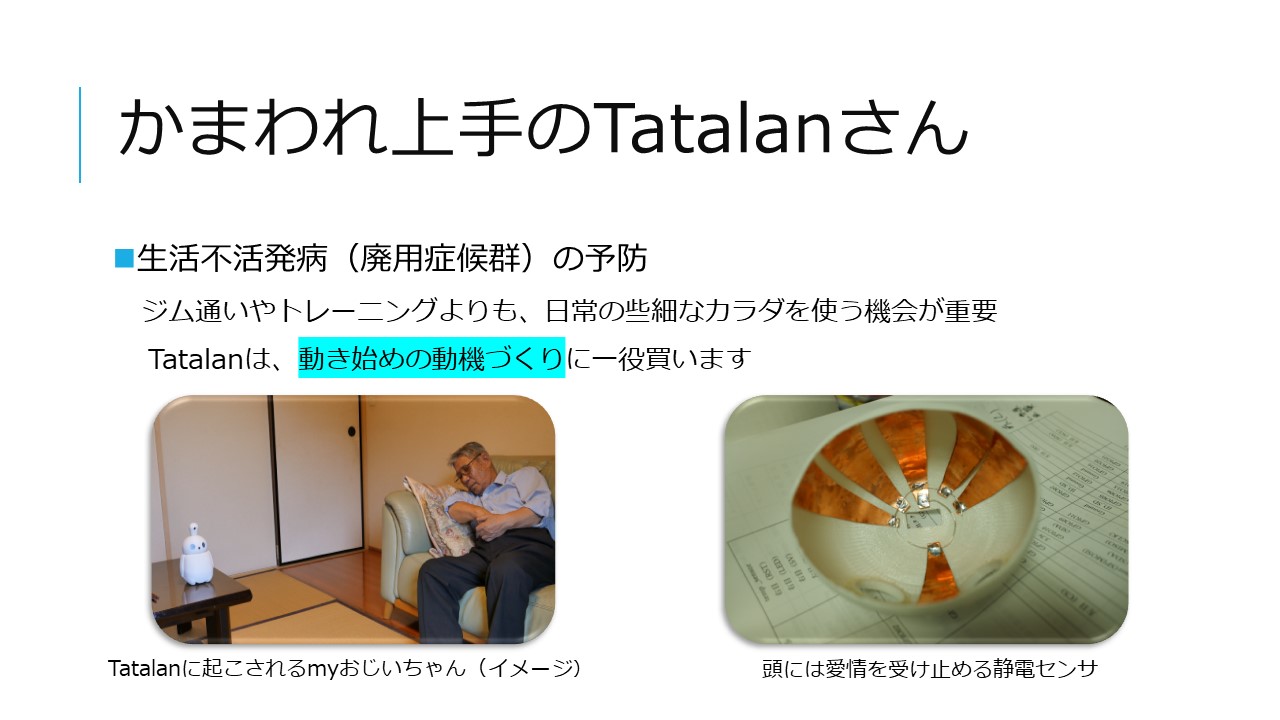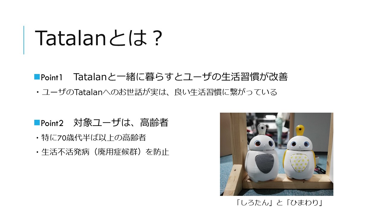 「なんだか、こいつが家に来てからなんだか元気になった。」がコンセプトの高齢者向けパーソナルヘルスケアロボットTatalan。