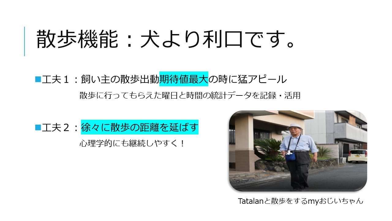 ポイントは、ロボットが高齢者の為にお世話をするわけでなく、高齢者がロボットをお世話するとそのお世話が実は健康的な生活習慣に結びついているというところです。また、愛らしいロボットのハードウェアを備えることでスマートフォンやウェアラブル端末より効果的なインターフェースになりえると仮説を立てています。
