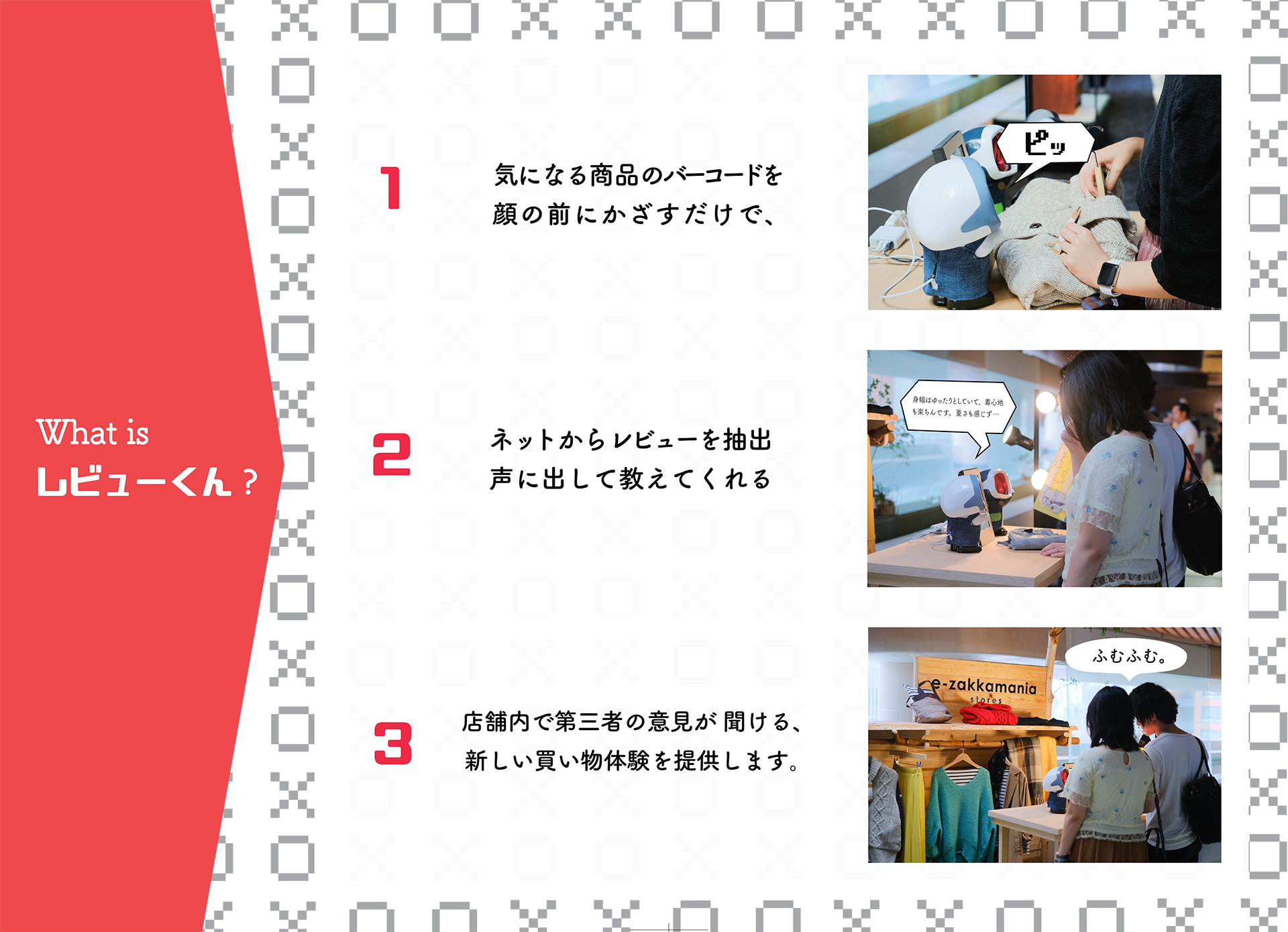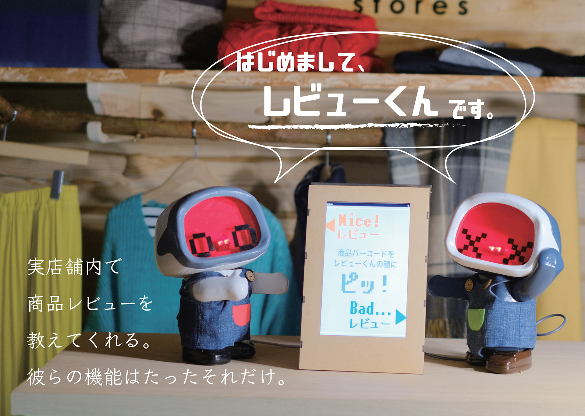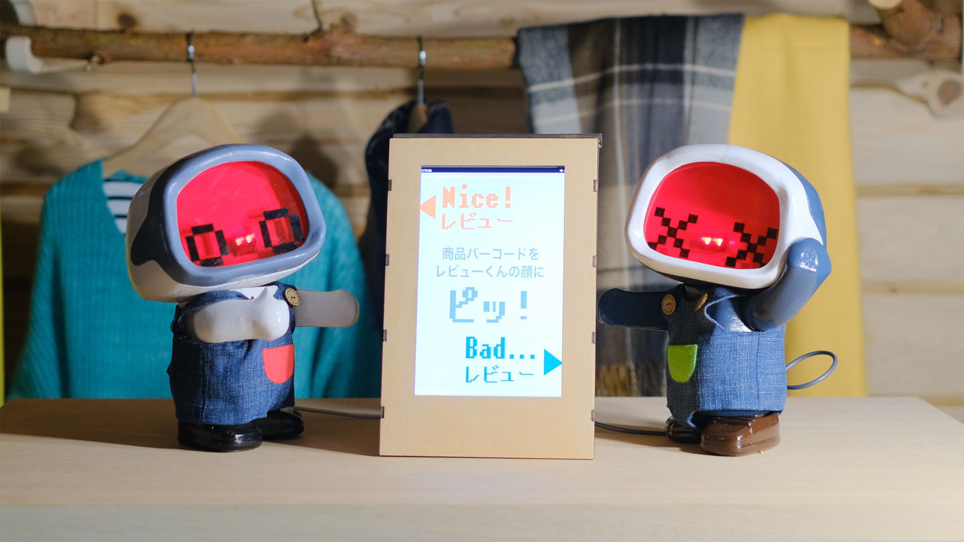 レビューくんは、店頭での商品選びを助けてくれる2体のかわいいコンビ。対になる愛らしい2頭身のキャラクターは、バーコードリーダーがモチーフで、それぞれ「良いレビュー」と「悪いレビュー」を担当。気になる商品のバーコードを読ませると、楽天市場から抜粋した商品レビューを声とミニディスプレイを使って、わたしたちに教えてくれます。お店の店員ではなく、商品を実際に購入した人(第三者)のリアルな口コミを聞くことができ、より納得して商品を選ぶことができます。