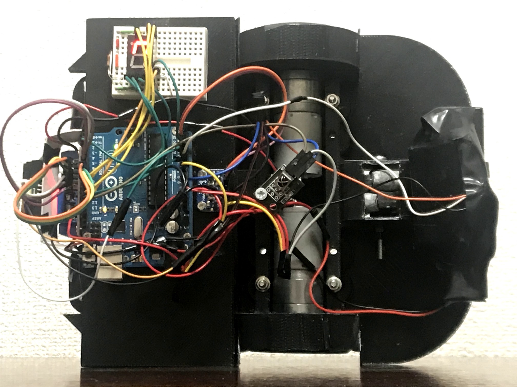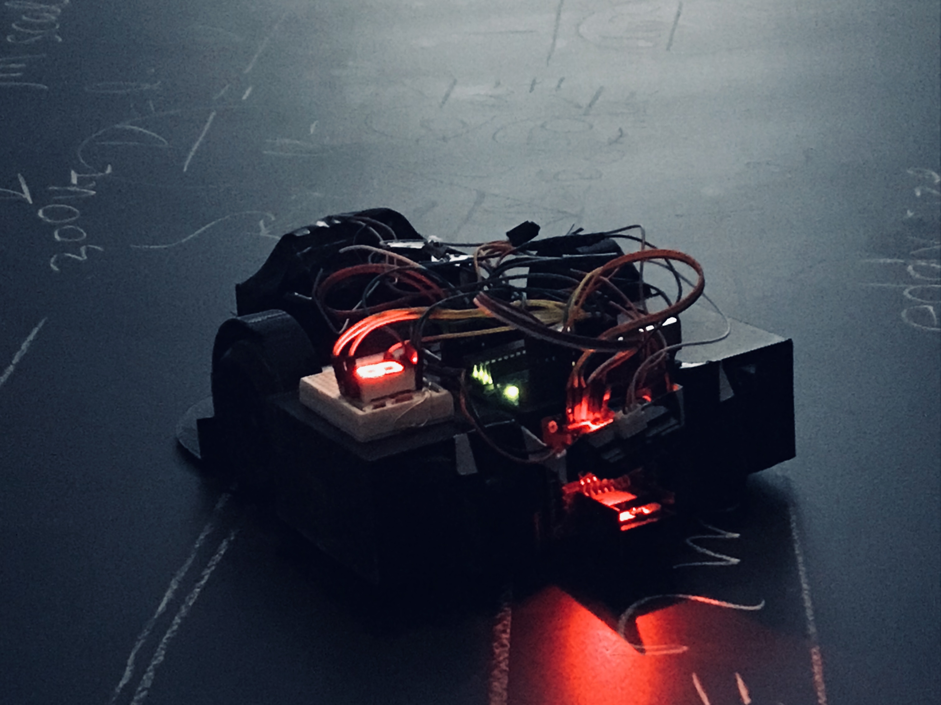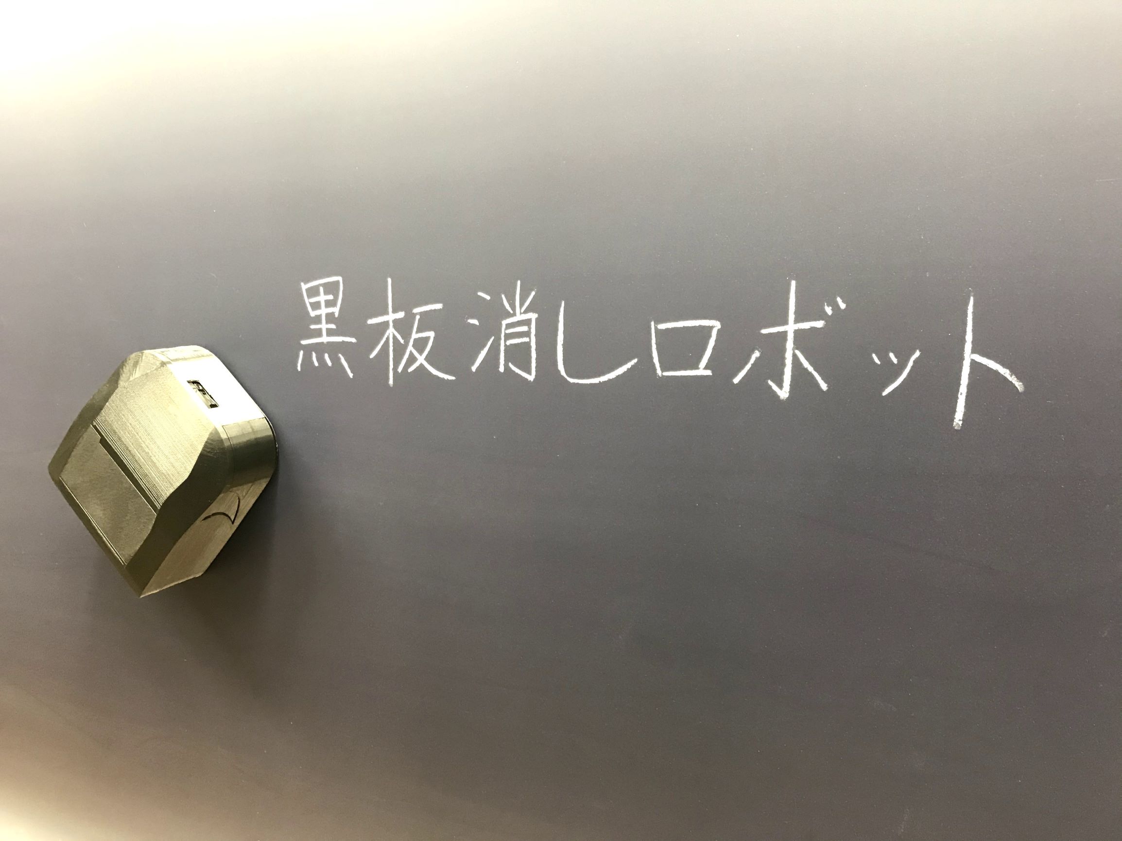 磁石で黒板に張り付き、モーターを駆動して黒板消しを引きずることで板書を消します。加速度センサで傾きを検知して水平に移動し、また赤外線測距センサを用いて黒板の端を検知します。
