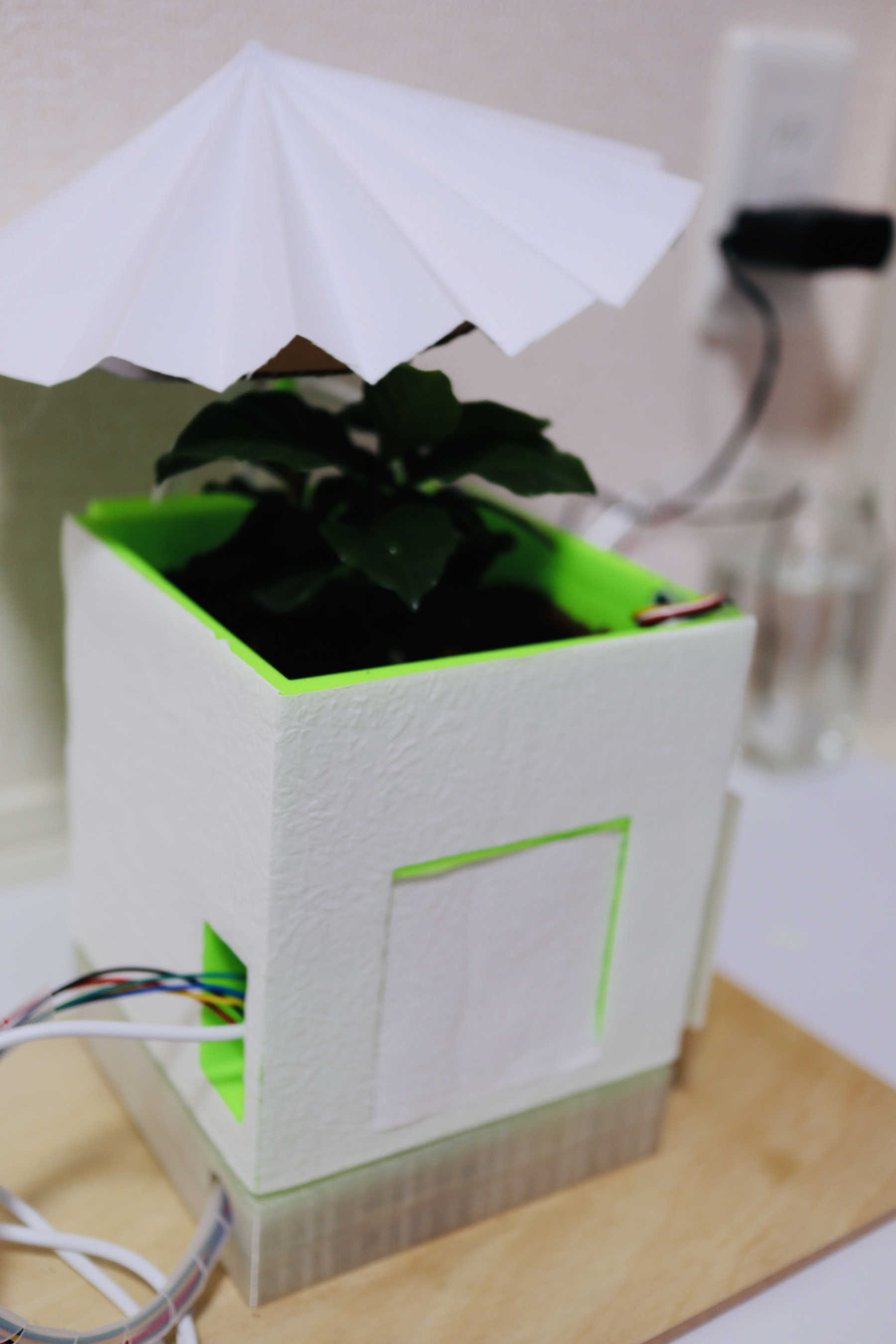 植木鉢には土が乾いているかどうか、日光が足りているかどうかを知る機能があり、状態に応じて備え付けられた傘から植物に必要な波長の光と水分を補給します。