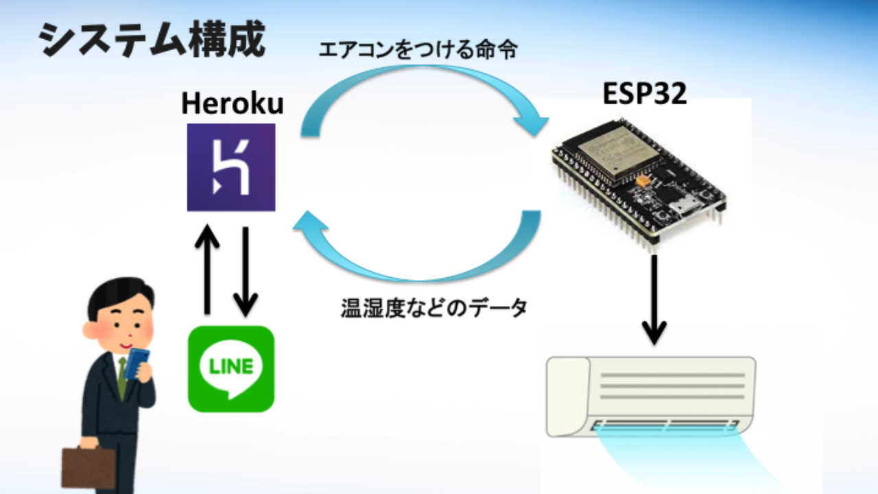 このシステムを実現させるために我々はHerokuのアドインであるCloudMQTTとESP32というWi-Fi通信可能なマイコンを利用し、LINEからのデータの受け渡しをすることでデバイスの遠隔制御を可能にしました。
