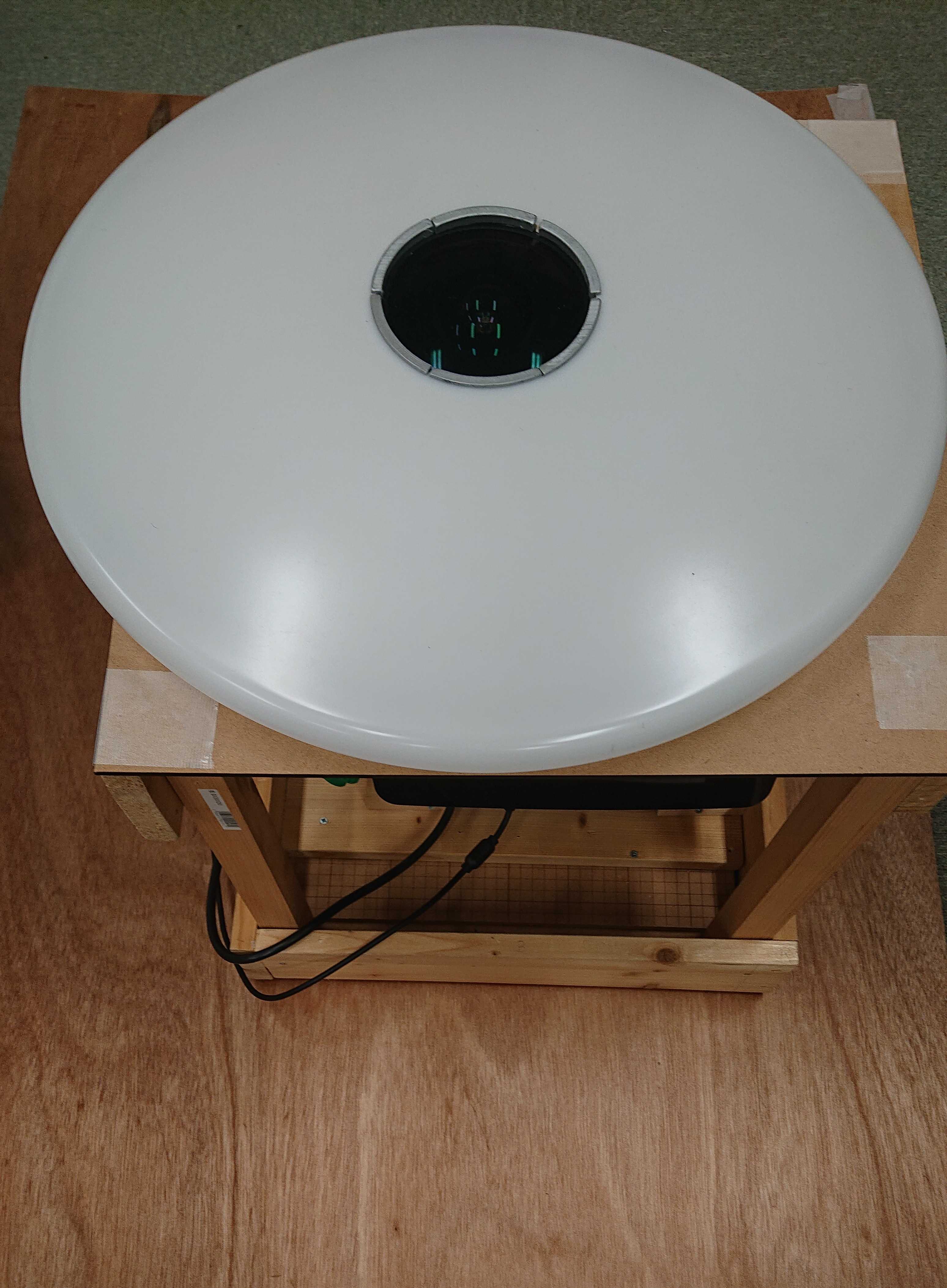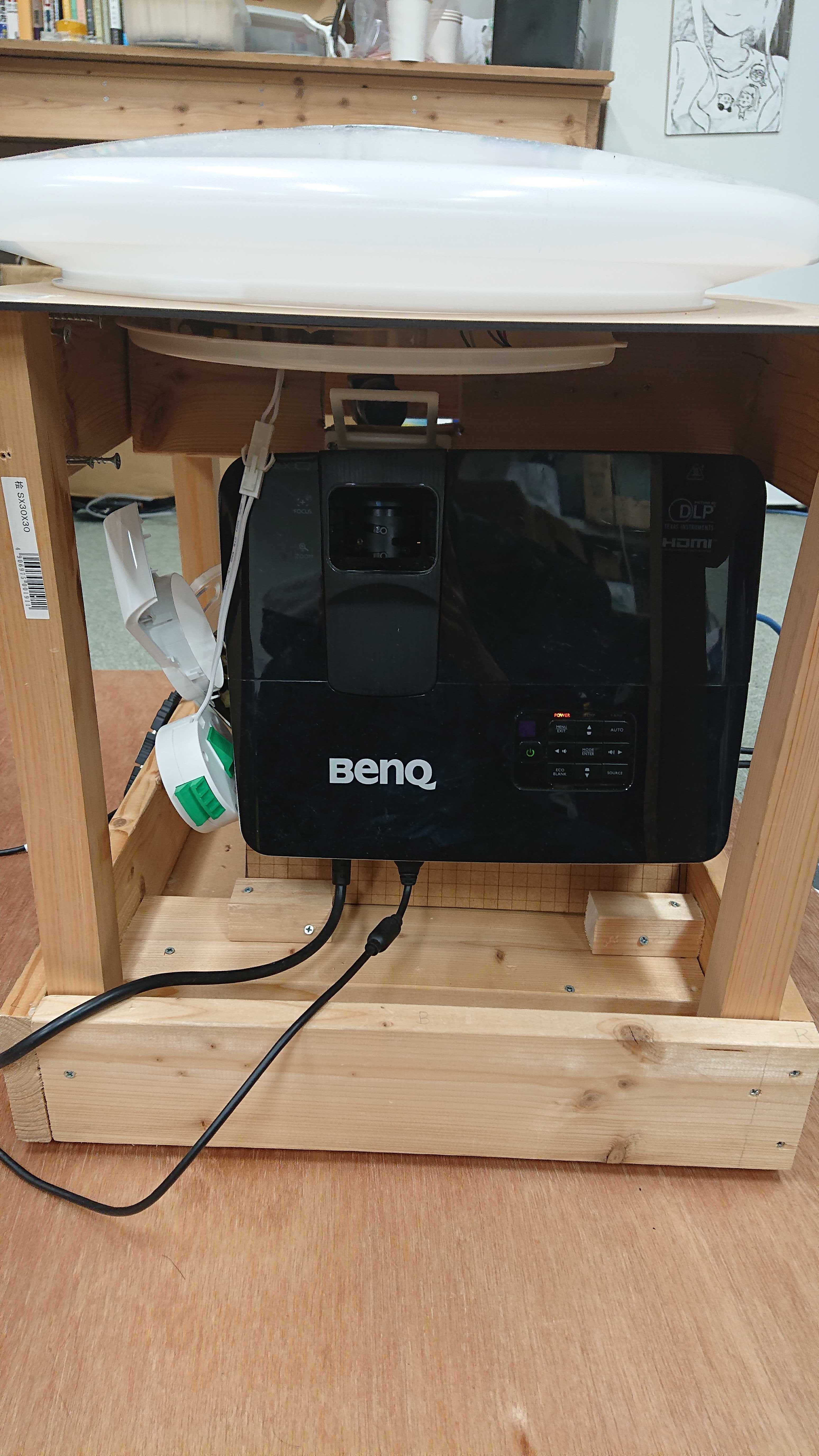 魚眼レンズを用いてプロジェクタ光を180度に拡散させることで部屋全体にプロジェクションマッピングすることを可能にした天井照明装置です。天井に取り付ける際は紹介動画のようにLEDと魚眼レンズの部分のみが天井から顔を出すイメージです。