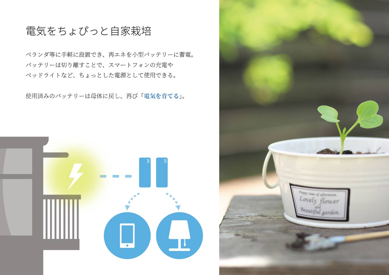 『Planter』のコンセプトは「電気をちょぴっと自家栽培」です。ベランダ等に手軽に設置でき、再エネを小型バッテリーに蓄電します。バッテリーは切り離すことでスマートフォンの充電やベッドライトなど、ちょっとした電源として使用できます。使用済みのバッテリーは『Planter』本体に戻すことで、再び「電気を育てる」ことができます。