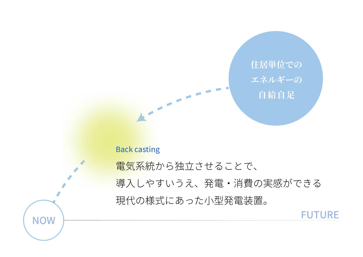 また、そんな未来からBack castingしたとき、電気系統から独立させることで、導入しやすいうえ、発電・消費が実感できる、現代の様式にあった小型発電装置 が必要だと考えました。