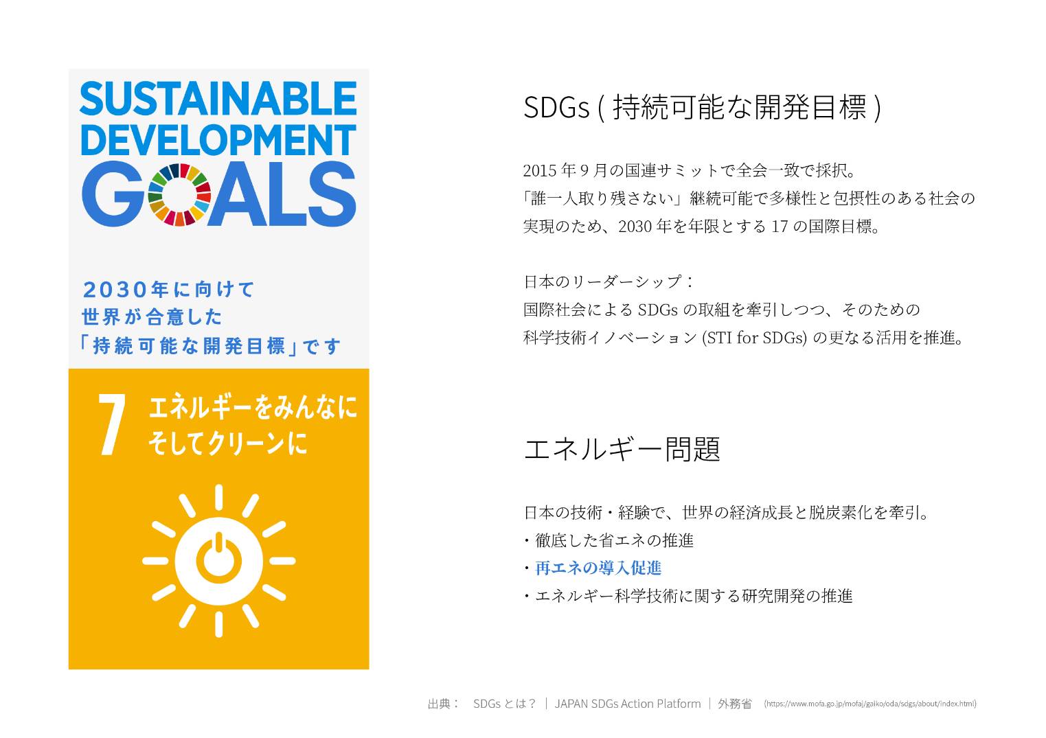 日本ではエネルギー自給率の低さや化石燃料への依存度の高さから再生可能エネルギー(以下、再エネ)の導入を促進しています。これはSDGsにおけるエネルギー問題への活動としてもあげられています。