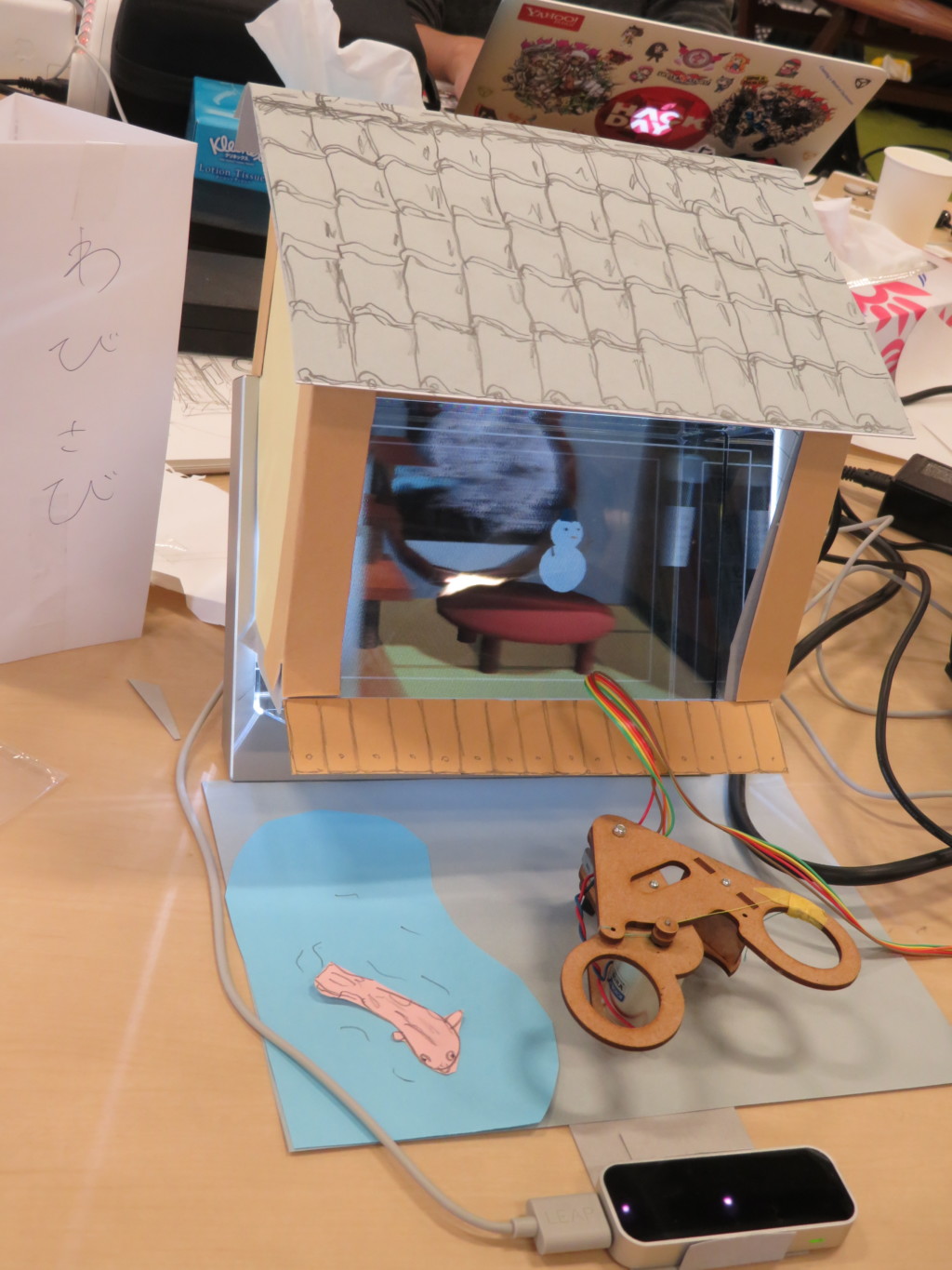 中にあるいろいろなオブジェクトはハサミ型の触覚デバイスで感触を持ってつかむことができ、