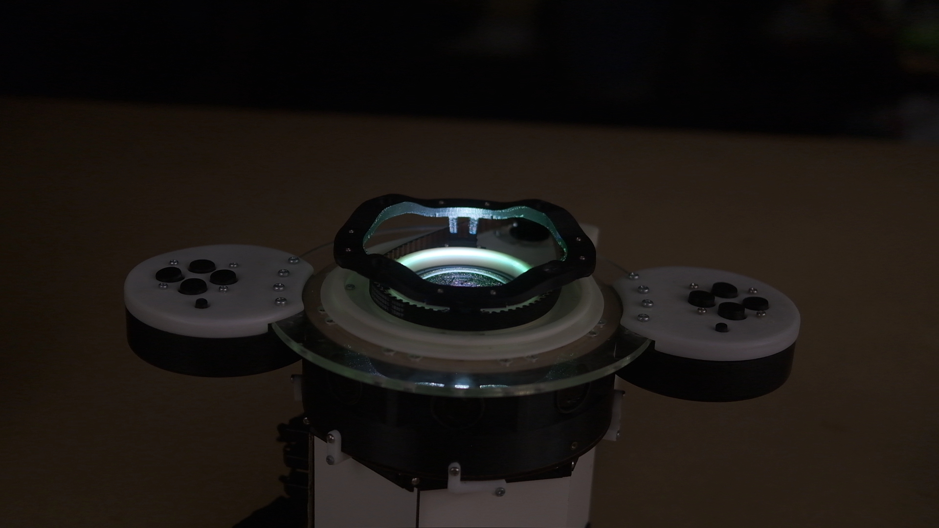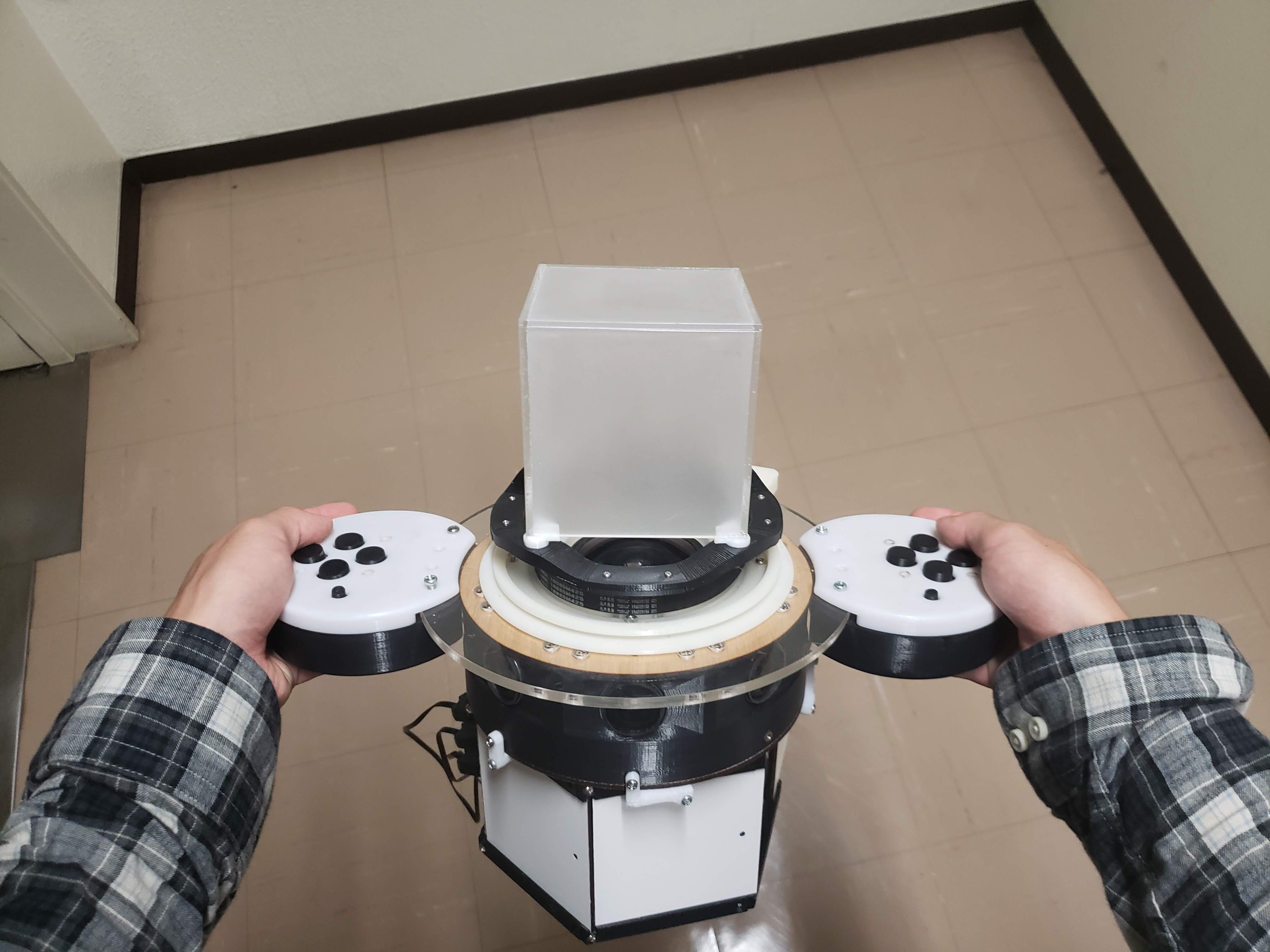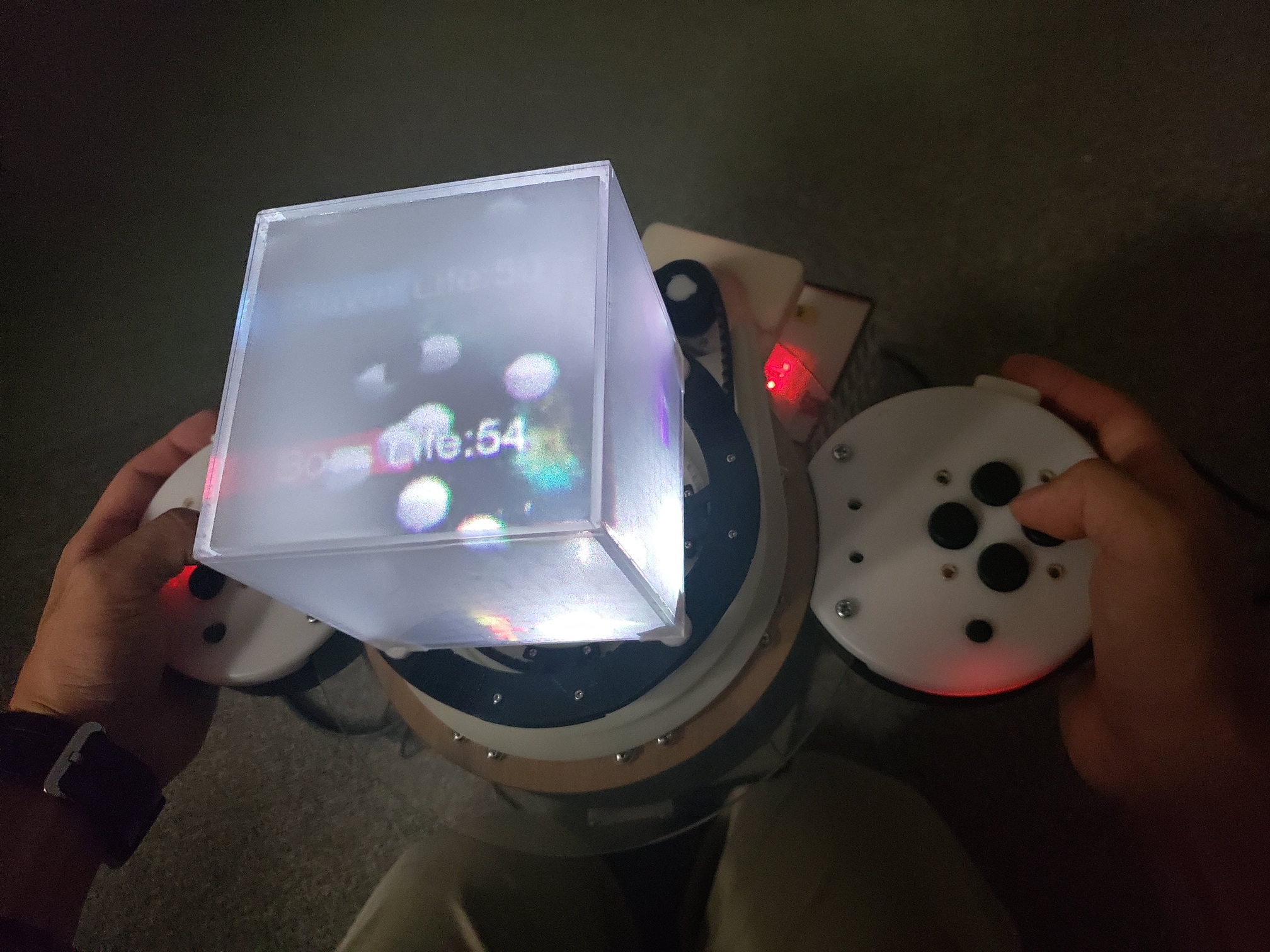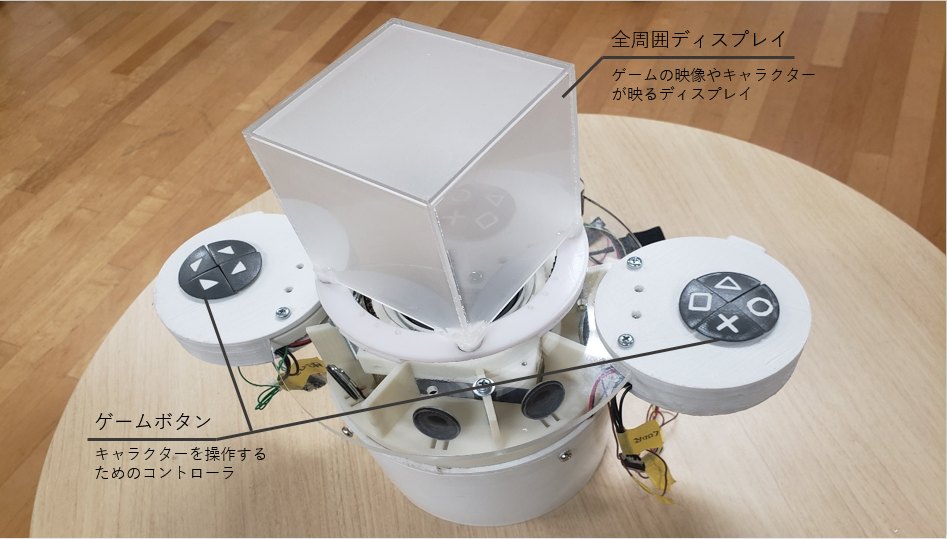 そこで私たちは、これらのゲーム体験を実現する新しい独自のゲームデバイス”UPLIGHT”を開発しました。UPLIGHTでは内蔵する小型プロジェクタと超広角魚眼レンズを用いた全周囲投影技術に加え、自由に取り換えることができる様々な形状の全周囲スクリーンにより、立体的で連続的なゲームコンテンツを実現しました。さらに手首や頭など上半身を自由に動かすことでダイナミックに全周囲ディスプレイ上のゲームと対話することが可能です。