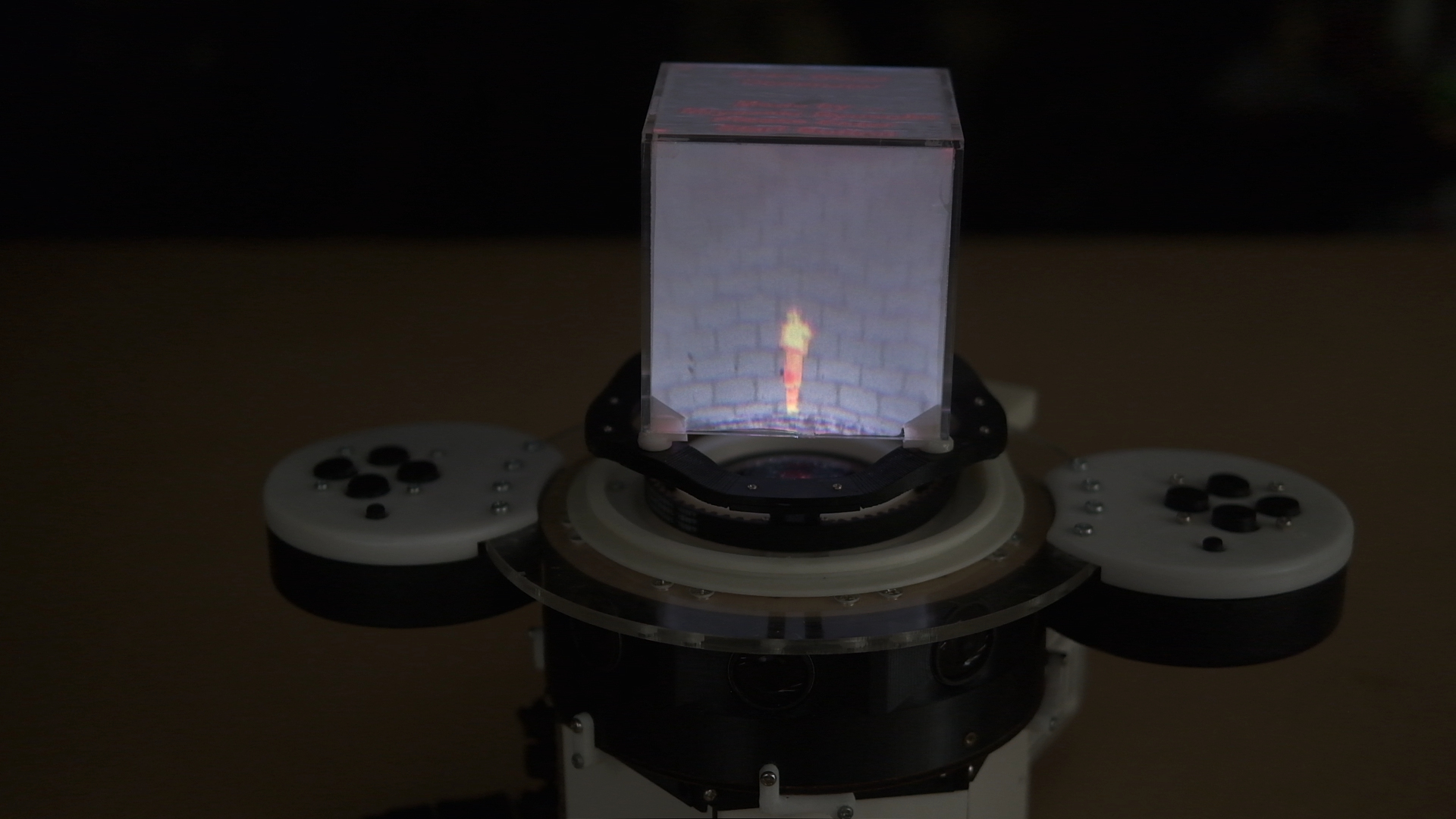 しかし、私たちが「高さのある側面」を持つ立体映像を眺めたとき、私たちに対して手前側の側面を見ることはできますが、反対側の側面は手前側の側面の背後に隠れて見えなくなってしまいます。この「隠れた部分が見えない」という要素は全周囲ディスプレイの欠点でした。
