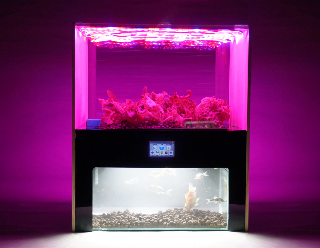 この装置はミズアブによる生ごみ処理とアクアポニックスを合体させた装置です。生ごみを餌に成長したミズアブをアクアポニックスの魚の餌とすることで循環が行われます。アクアポニックスは魚から出るアンモニア,アンモニアを微生物が分解し生成される硝酸塩の濃度が最適値である必要があります。ミズアブを魚の餌として与える量をカウントし調整することで,アクアポニックスを成り立たせ,かつミズアブの循環も成り立つように成虫用の幼虫の数も考慮しながら各配分を決定します。この決定には,様々なセンサを用いた装置内部の環境の情報によって決定されます。