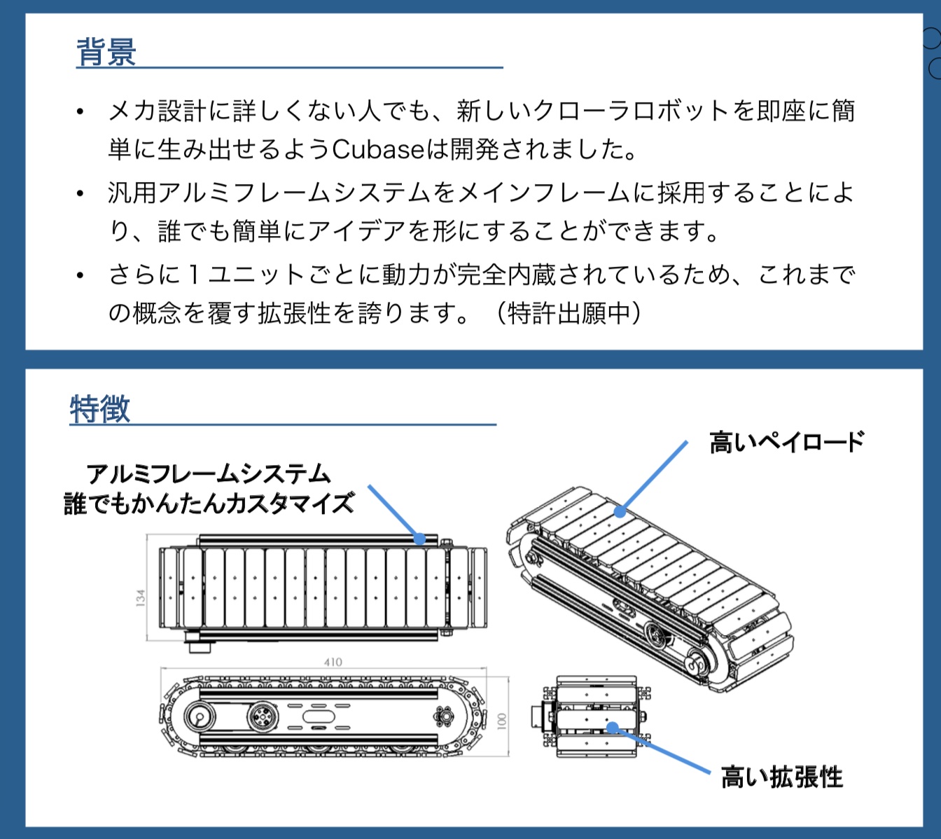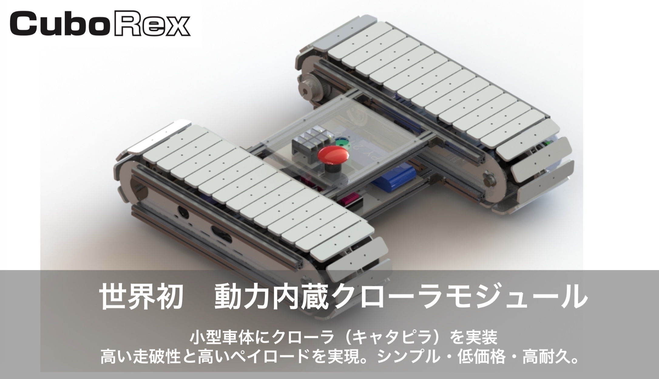 汎用クローラユニット「CuBase(キューベース)」はモーターをクローラ機構内に内蔵した独立型モジュールである.CuBaseは農業や災害派遣等など高い走破性が求められる作業機やロボット等の足回りとして用いることができる.