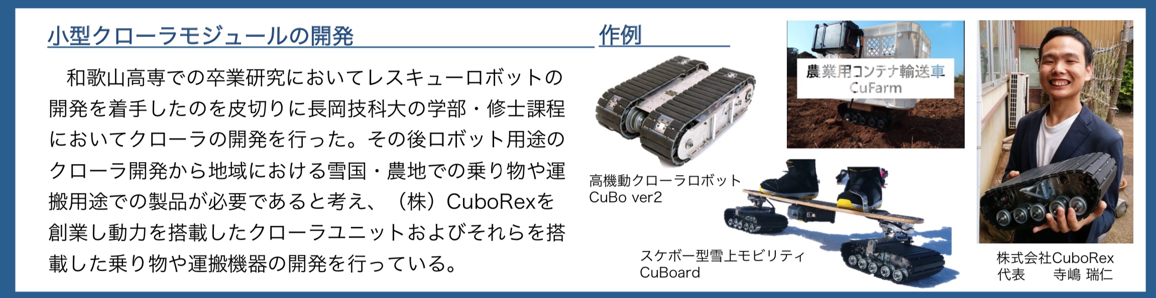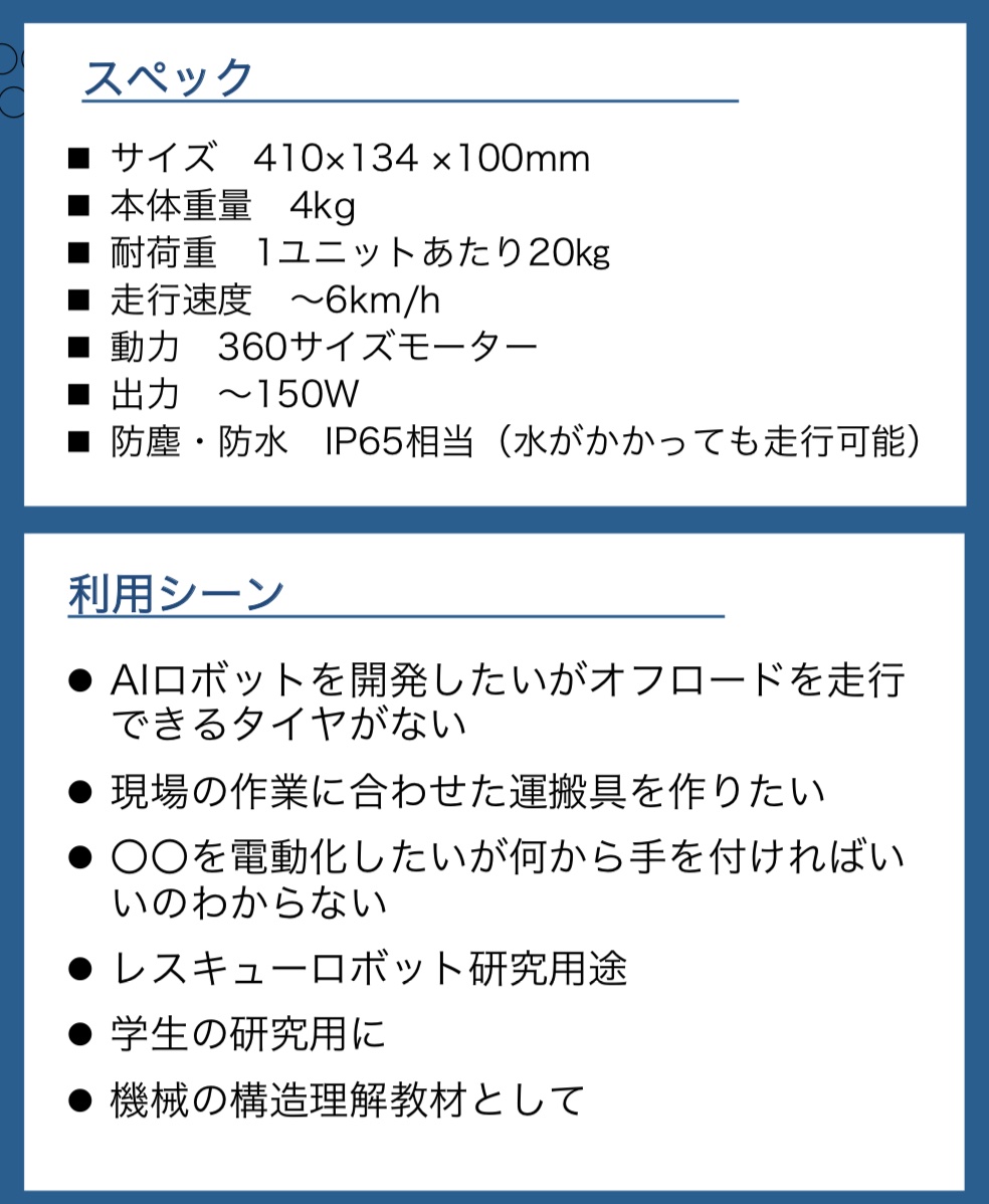 クローラやホイールの動力モジュール開発&それを使ったアプリケーション製品を販売している立ち上がったばかりの会社です