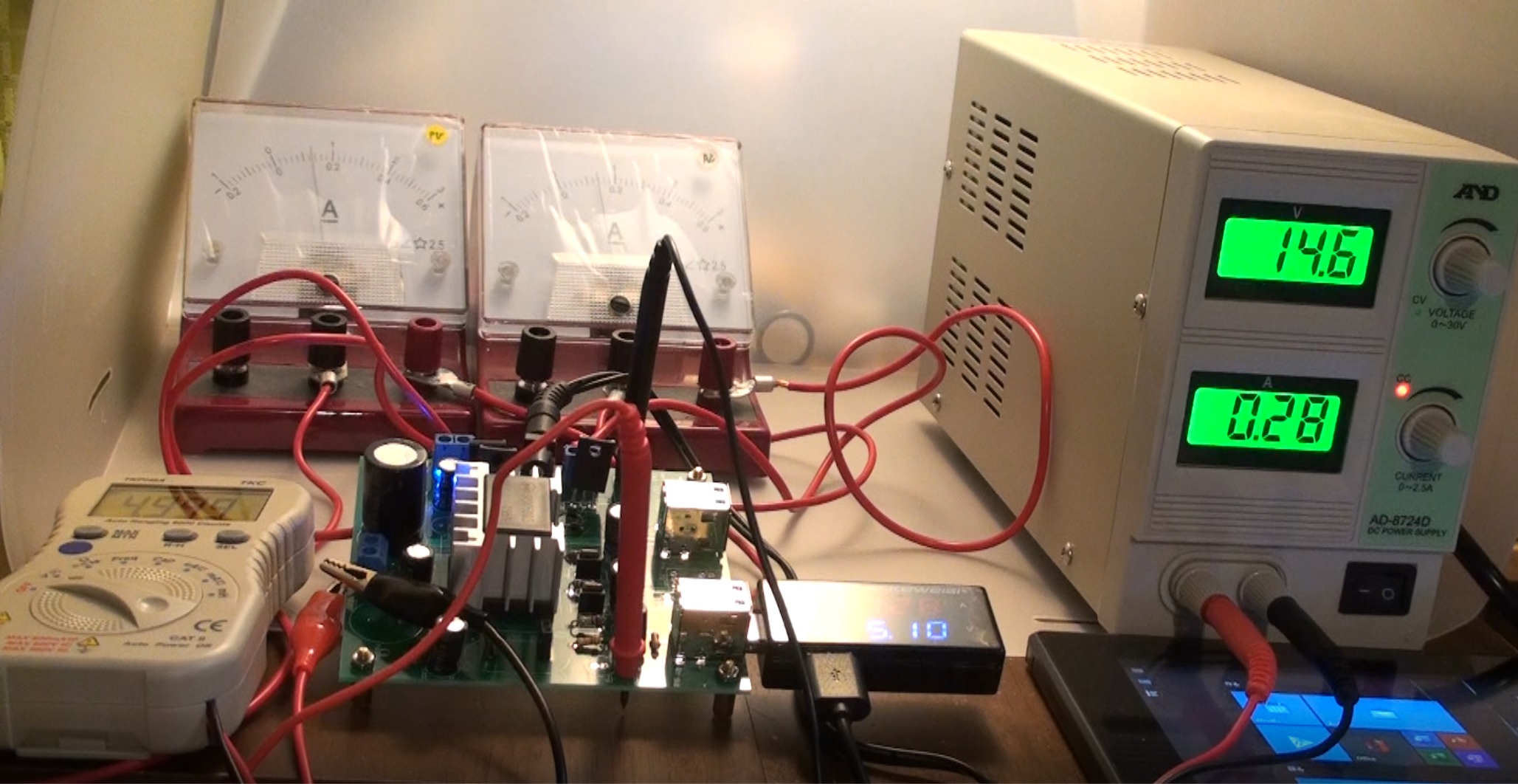 停電・災害時やキャンプに持って行ったときなど、商用交100V電源が得られない場合でも、太陽電池からの発電を最大限活かし、充電対象のUSB機器に充電します。このとき、あえて5Vに電圧変換する前の電圧を一定値(14.5V)以上でないと電力を出力しないことにより、効率よく充電対象のUSB機器に充電します。