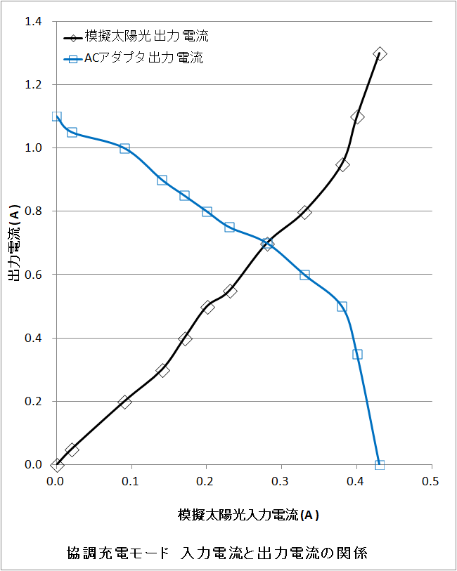 太陽電池がたくさん発電するほどACアダプタからの給電を弱くし、太陽電池の発電が弱くなると、ACアダプタからの給電を強くします。こうすることにより、常に太陽電池からの発電を最大限活かし、充電対象のUSB機器に最大速度で充電します。12Vの鉛蓄電池がある場合と異なり、使い過ぎを気にする必要はありません。また、太陽電池からの電力は、一定値(14.5V)以上の電圧から直接USB充電用の5Vに変換するため、12Vの鉛蓄電池がある場合より変換の効率がよいです。