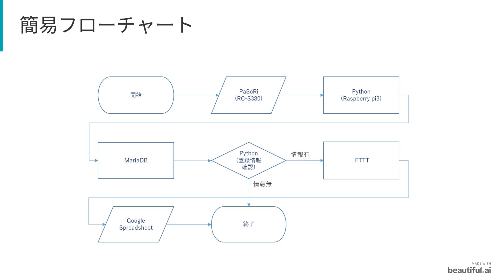 ・PaSoRi(SONY製NFCリーダー)からIDmを読み込み、 DBの情報と照会。