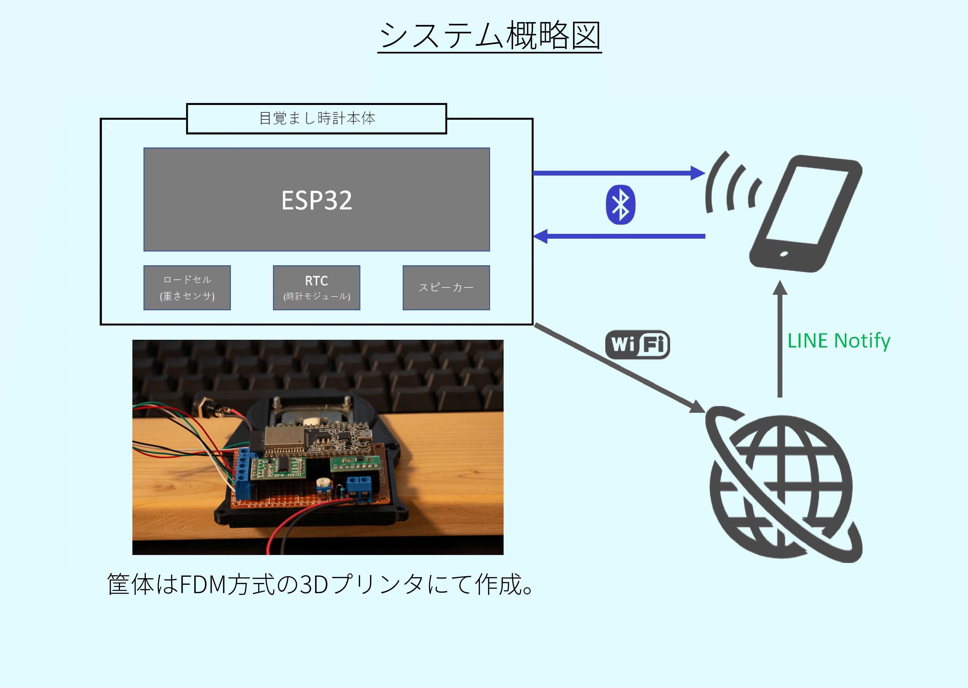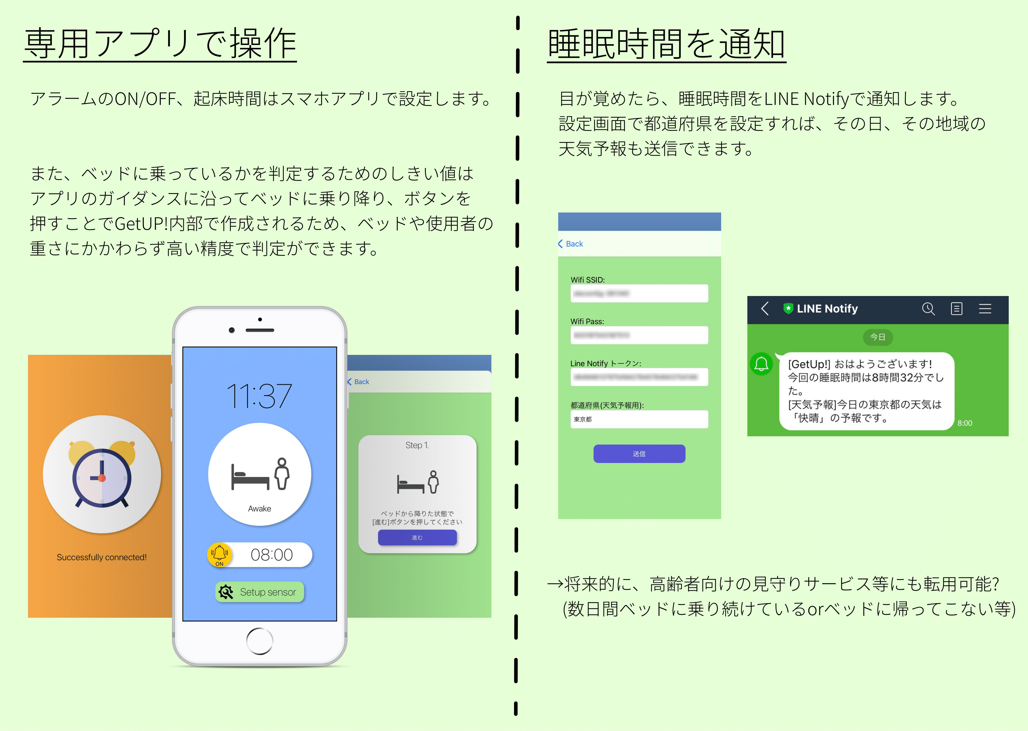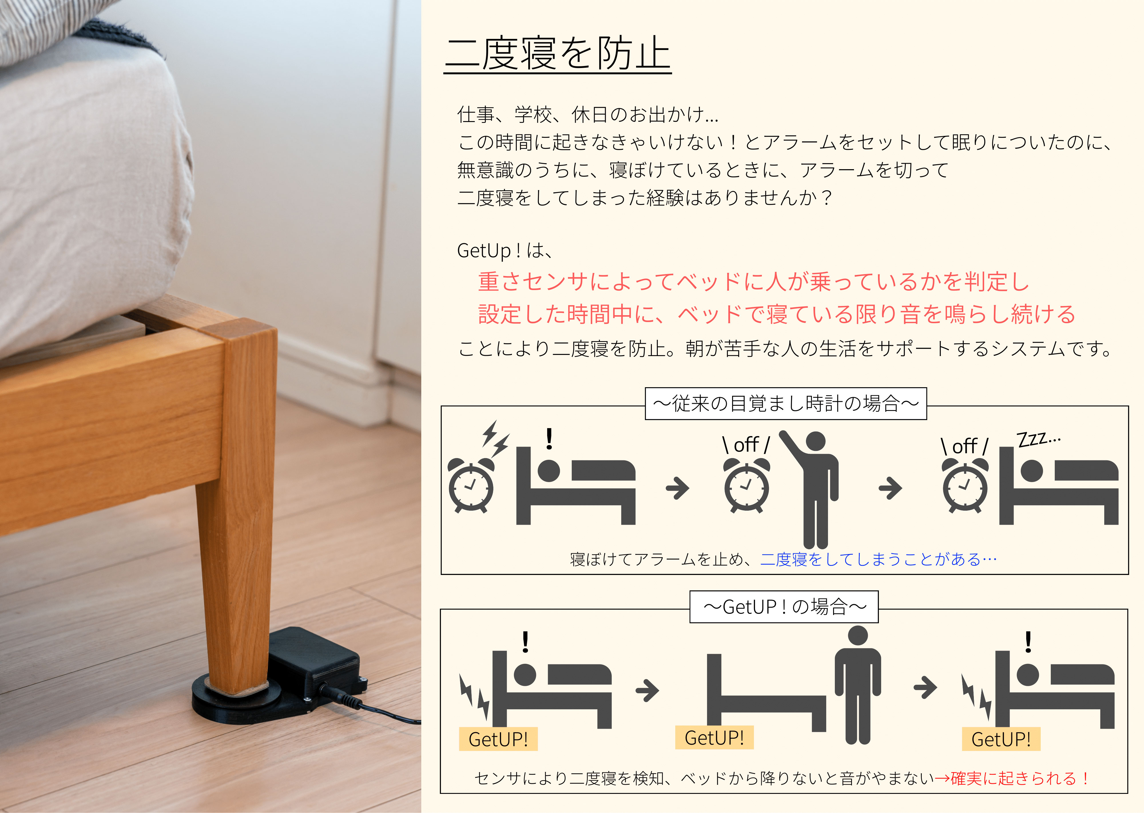 GetUP!は、起きるまで止まらない目覚まし時計です。ベッドの重さを監視することでベッドの上に人がいるか否かを判定し、起床設定時間を超えてから30分が経過するまでの間にベッドに人が乗っている場合、アラーム音を鳴らし続けます。