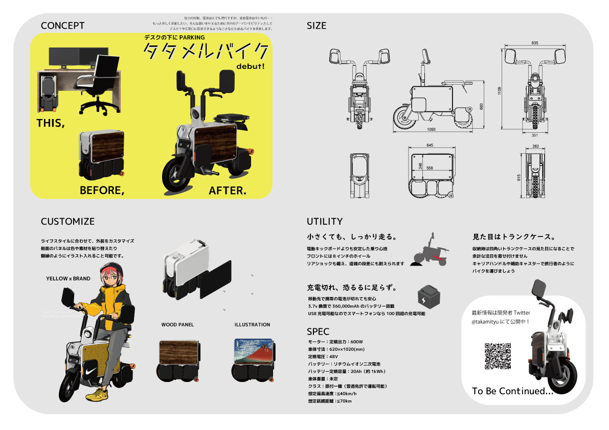 電動バイクや電動キックボードなど、気軽に使えるEVが海外で台頭してきているなか、日本のライフスタイルや法規制に対応したバイクとしてデザインしました。