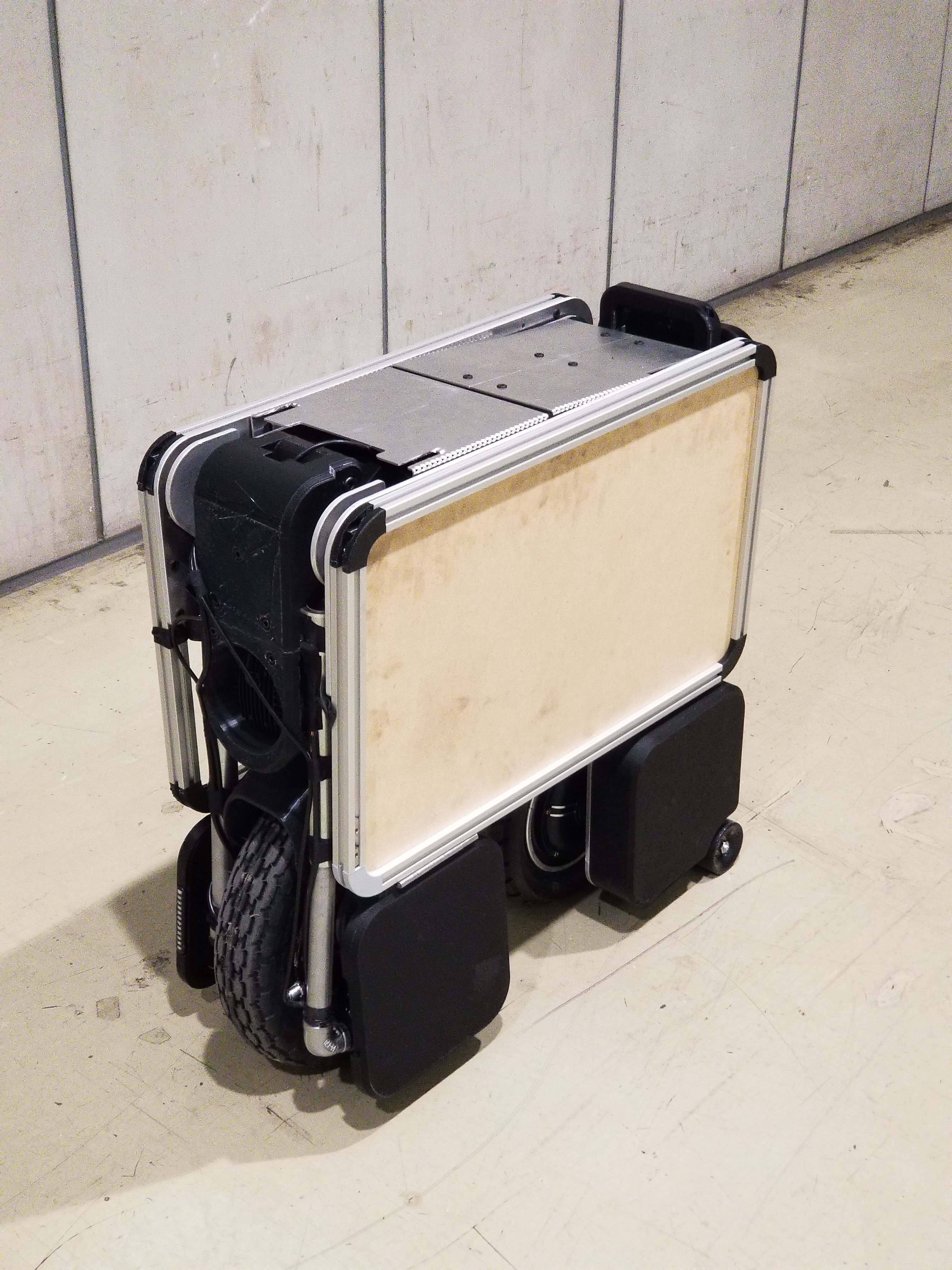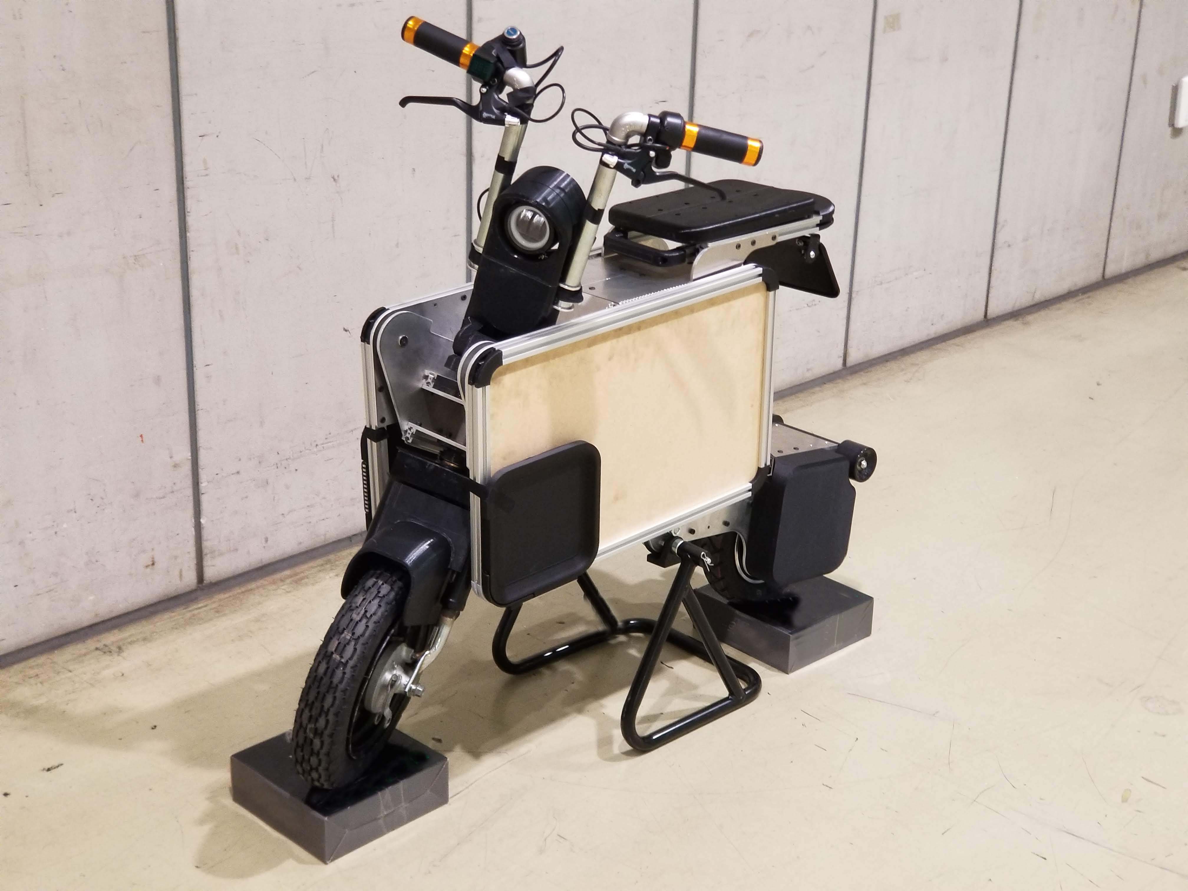 約65cmx62cmx25cmのトランク形状から、小型の電動原付バイクに変形します。