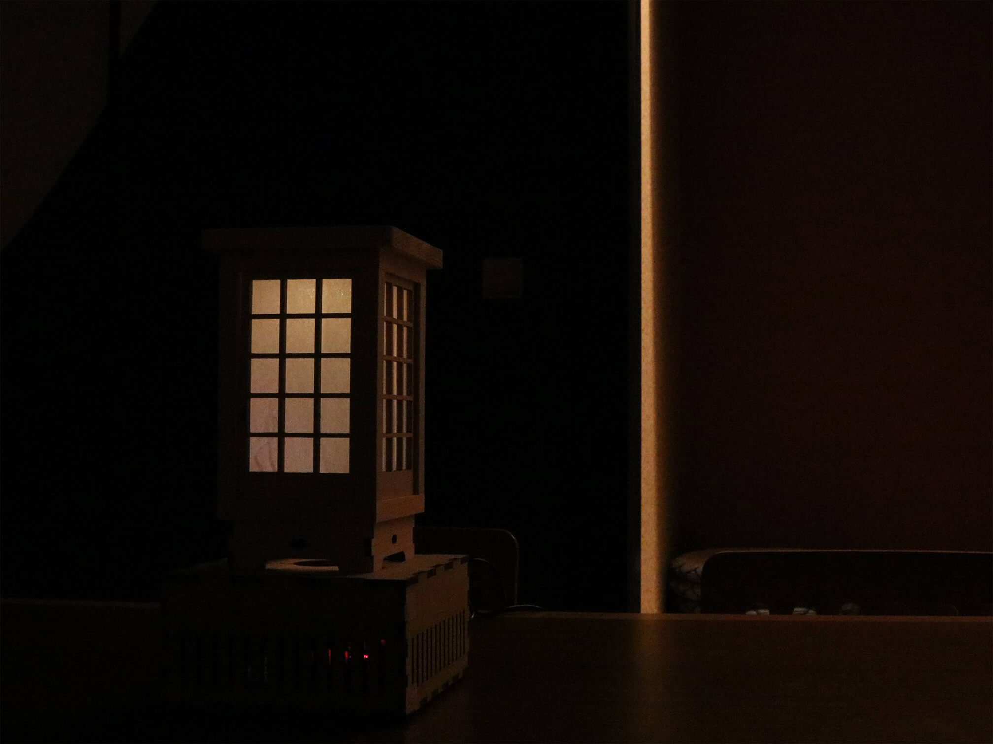 この行灯には、小人が住んでいます。この小人には、明かりに光を灯す力があります。小人は安全な住処を求めて、役目を終えた照明器具を渡り歩き、気に入った照明に住み着きます。今は、この行灯がお気に入りのようです。