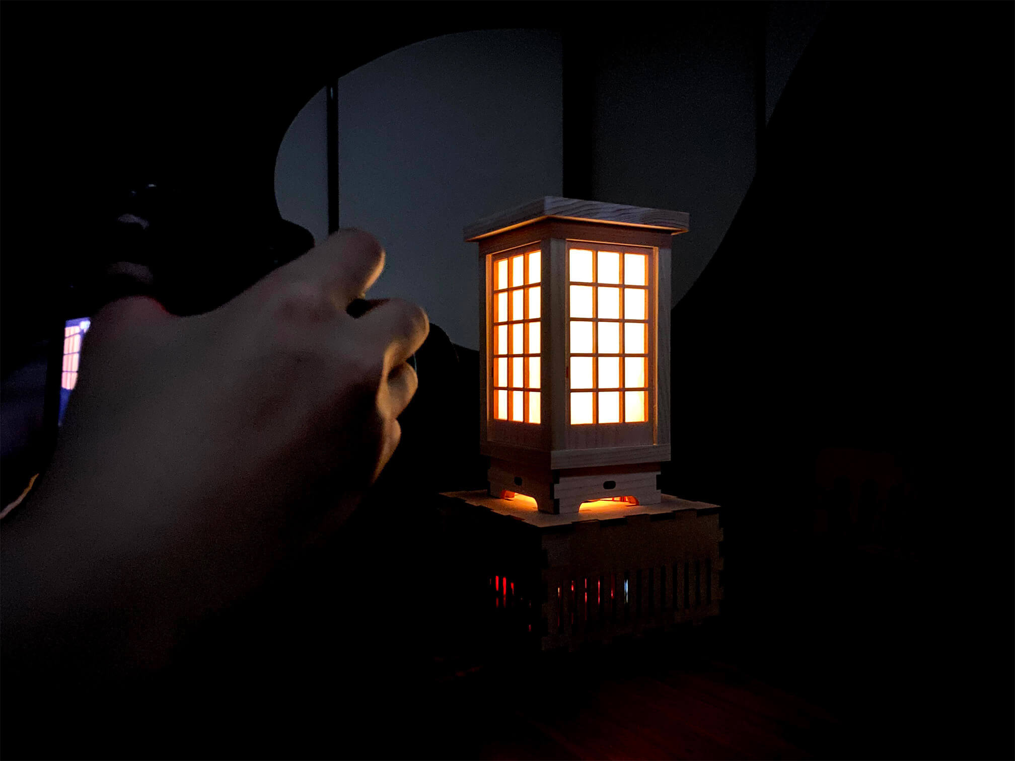 小人のすみかは、人や作品との「距離感」を意識させるインタラクティブアートです。小人の住む行灯は、人が近づくと暗くなり、離れると明るくなります。一般的な照明器具とは対照的な、この不思議な挙動を通して、「距離感」について考えるきっかけが生まれると考えます。
