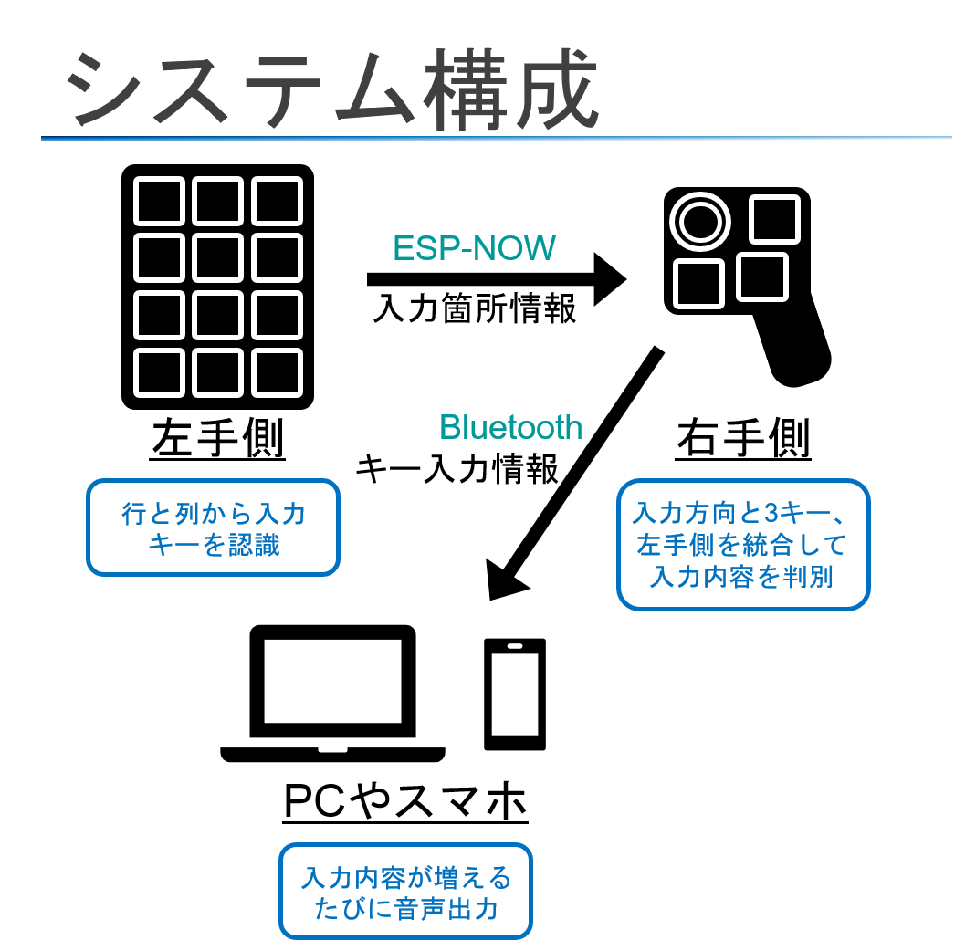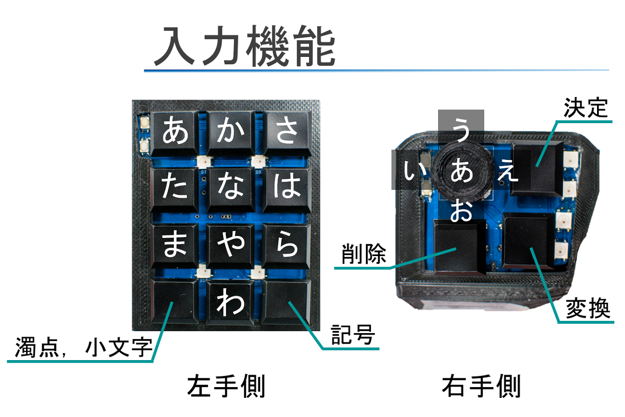 物理的・機能的に左右に分割されたキーボードを用いて、左手側で「あかさたな...」を指定し、右手側で「あいうえお」の選択と決定・変換・削除を入力することが可能です。