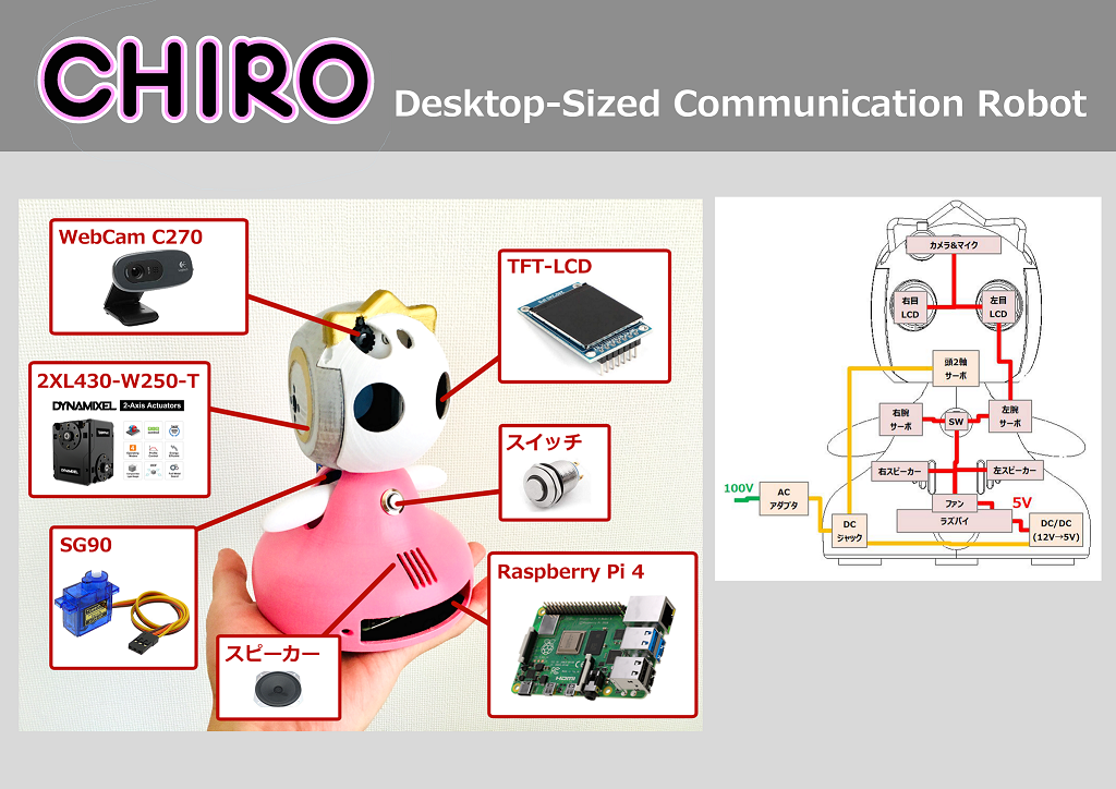 ヘッド部はパンチルトの2軸可動。マイク、スピーカー、カメラなどが搭載。メインコンピュータはラズパイ4。