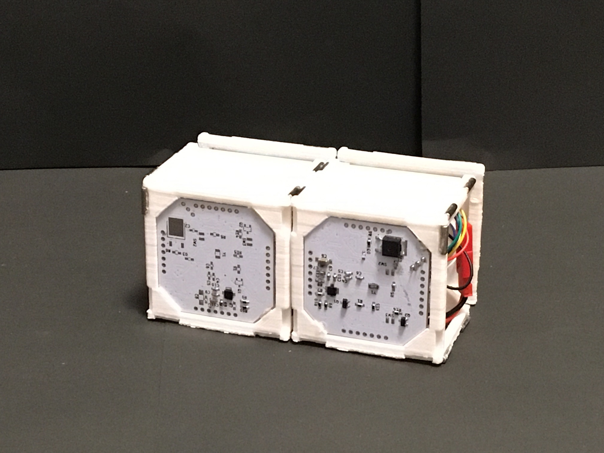 ロボットはWifi付きマイコン(ESP32)、エンコーダ+ギアードモータ(6V)、バッテリー(250mAh)、基板、マグネットで構成されています。サイズは1辺50mm、重さは1セット140gです。