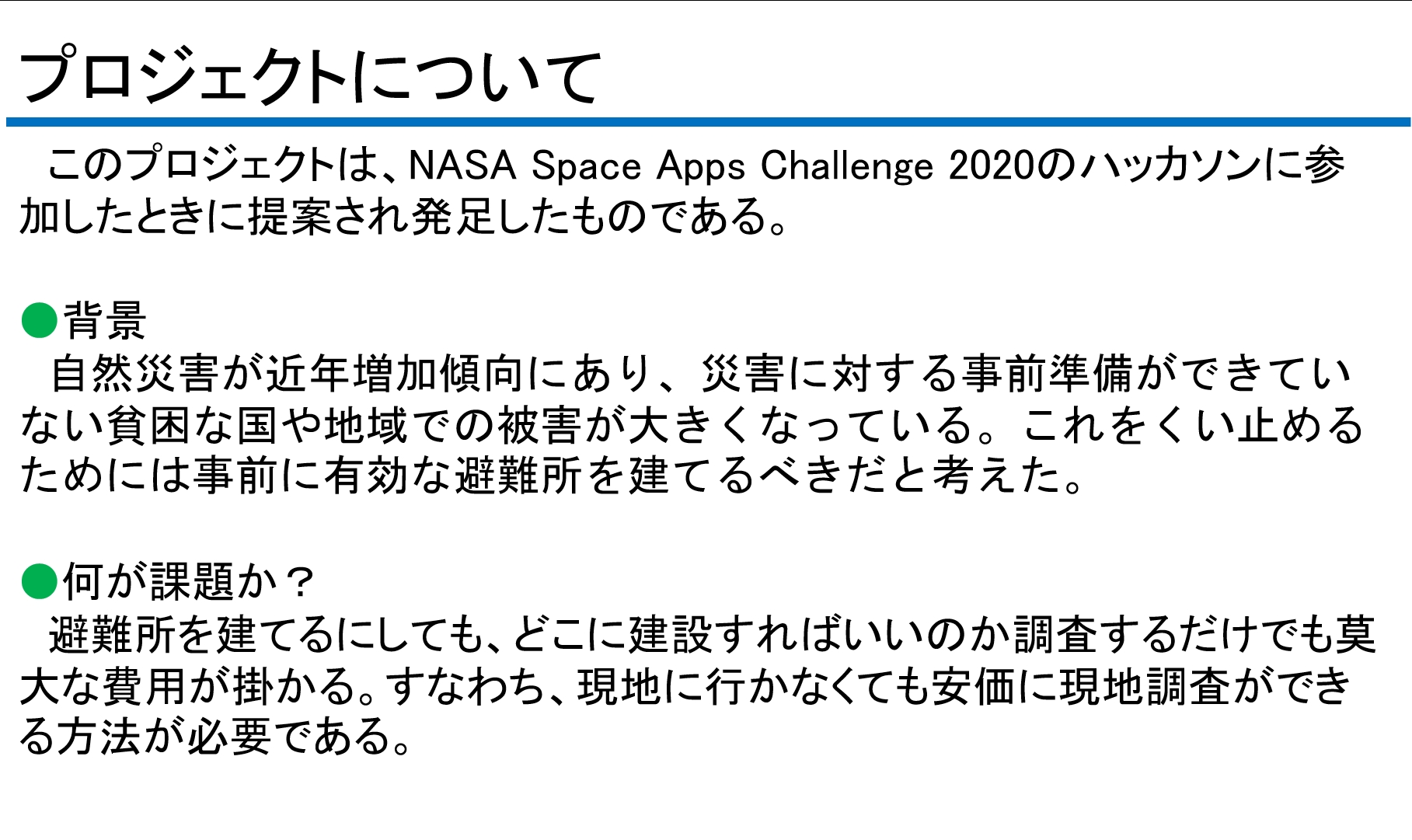 自然災害が近年増加傾向にあり、災害に対する事前準備ができていない貧困な国や地域での被害が大きくなっています。これをくい止めるために事前に有効な避難所を建てることが必要だと考えられますが、最適な建設の候補場所を調査するだけでも莫大な費用が掛かり非常に大変です。これを解決するために、現地に行かなくても安価に調査ができる方法が無いか考えて、今回の作品を作りました。