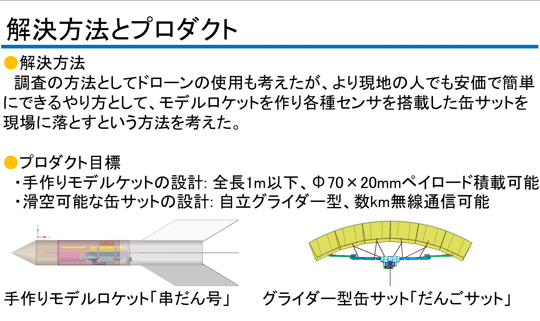 開拓されていない場所にお金と時間を掛けて入っていくことなしに、ローコスト且つ短い時間で現地情報を取得して提供できます。モデルロケットは工作レベルで作成できるので、現地の人でも簡単に手作りできます。