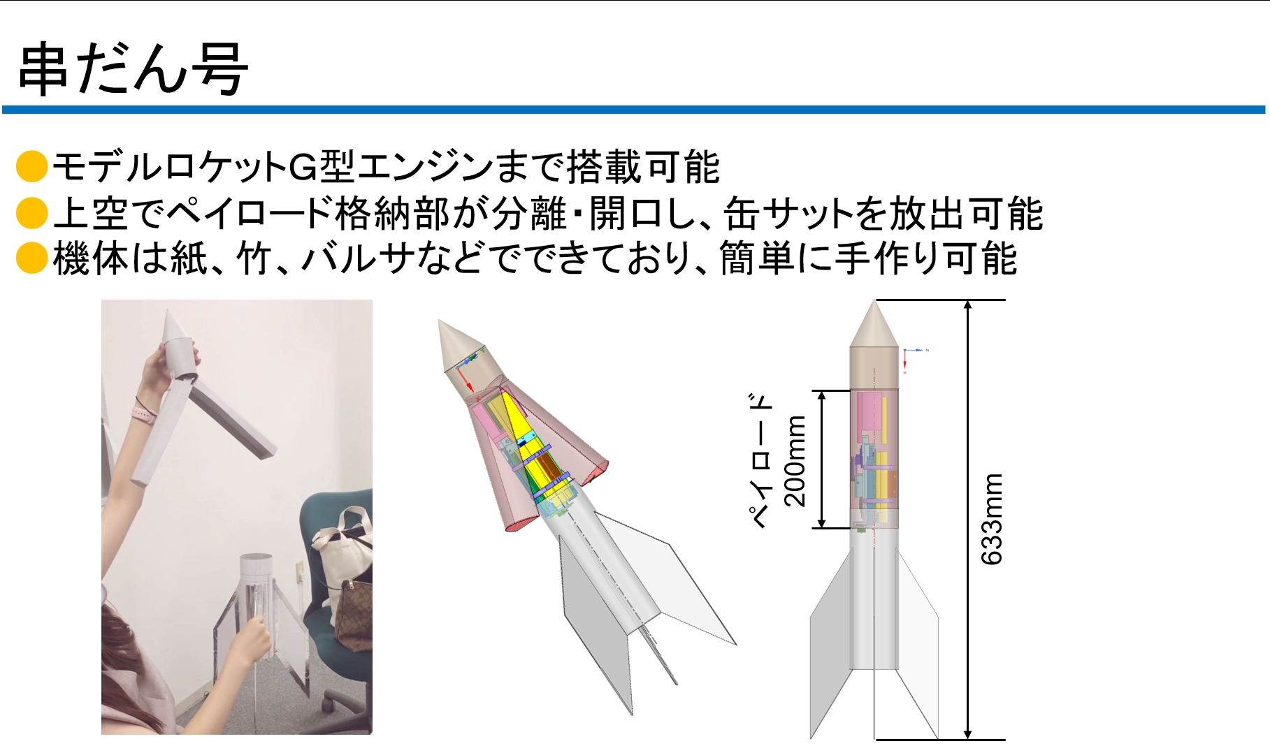 今回の作品「だんごサット」及び「串だん号」は模擬人号衛星とモデルロケットです。このロケット串だん号は紙製で安価に作れます。だんごサットも3Dプリンタで安価に製作できます。