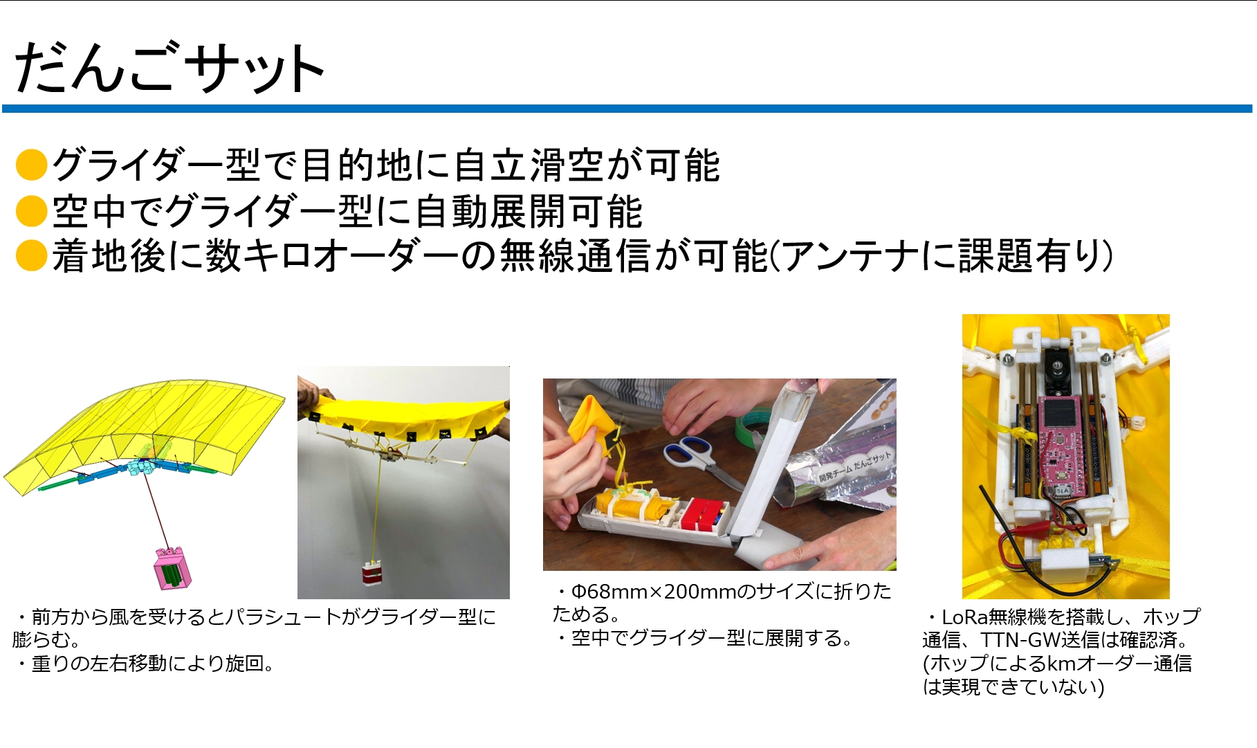 今回は「串だん号の試作」、だんごサットの「空中変形」、「重心移動旋回」、「LoRa通信によるホップ通信」の確認ができたところです。