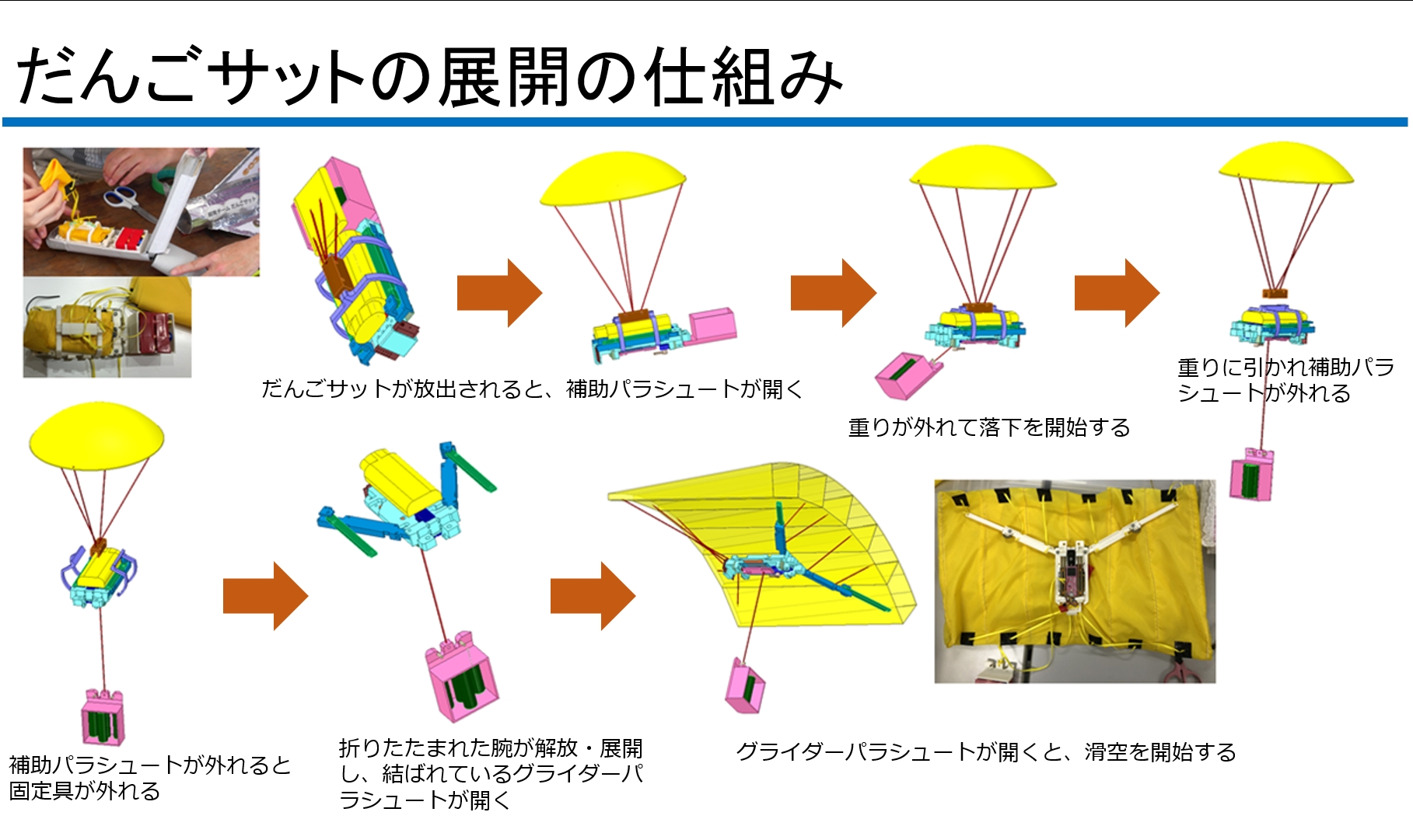 現地調査の方法は、串だん号にだんごサットを搭載し調査したい場所の上空まで打ち上げます。その後、だんごサットは放出され滑空グライダーに変形し、目的の場所を目指して落下します。