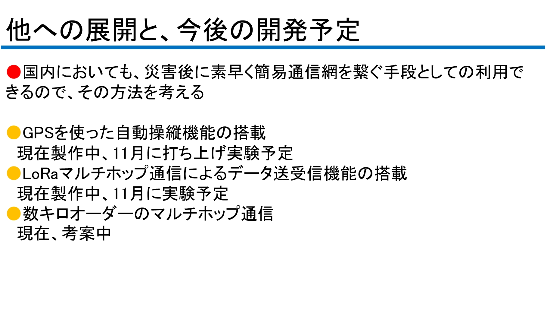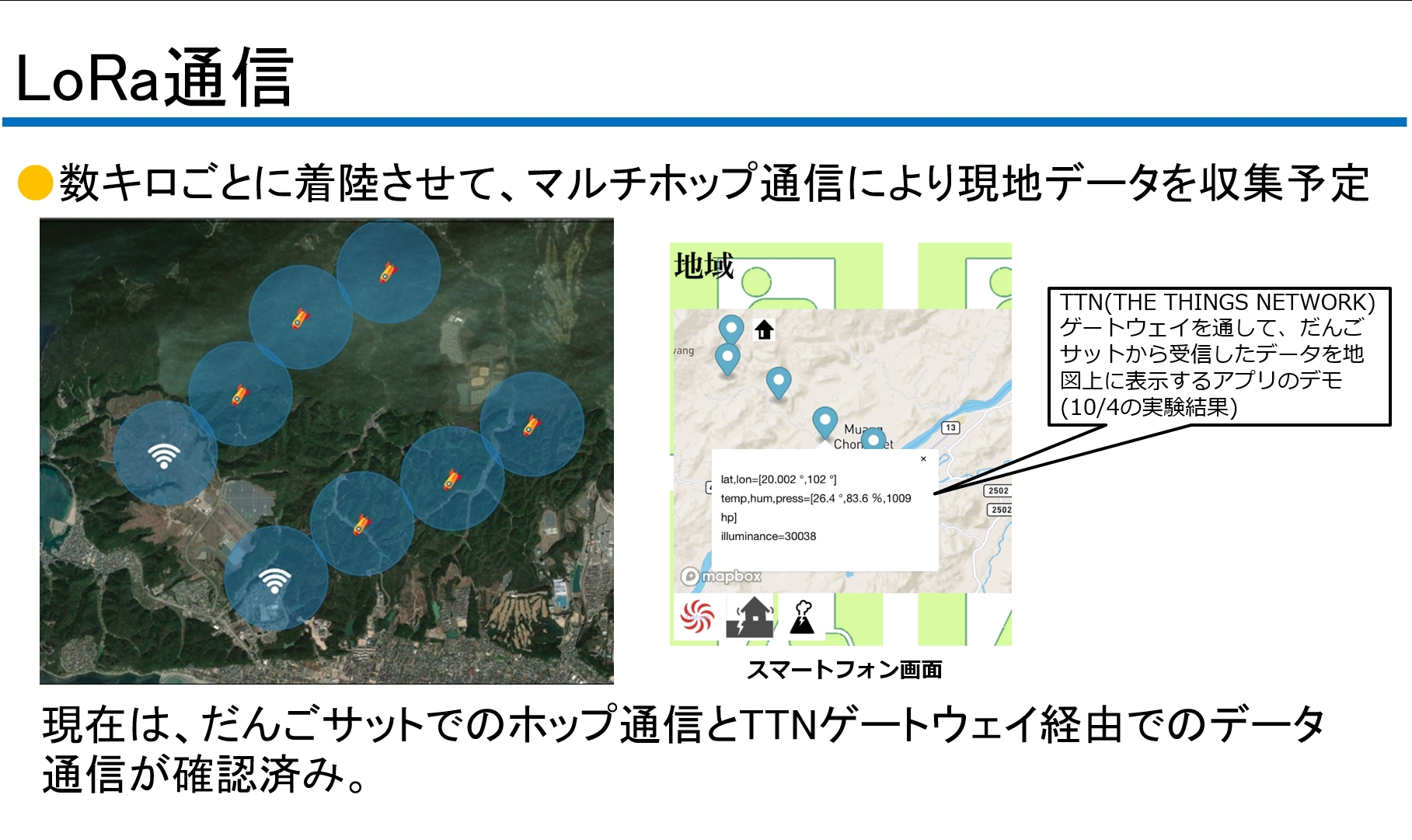 実機にはLoRaモジュールを搭載して、ホップ通信できることは確認しています。また、上空及び落下後にTTNゲートウェイ経由でサーバにデータを送信できることも確認できました。ただし、センサ搭載してのデータ送信テストはまだ行っていません。