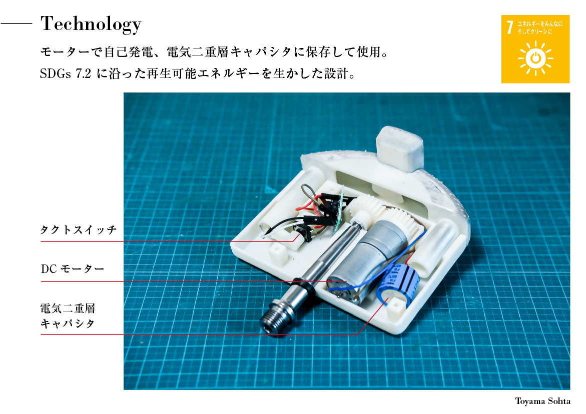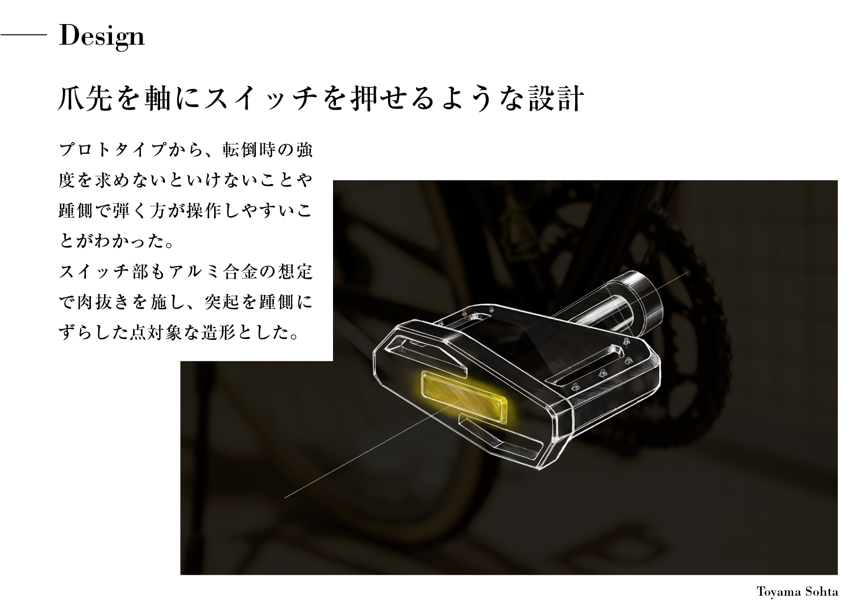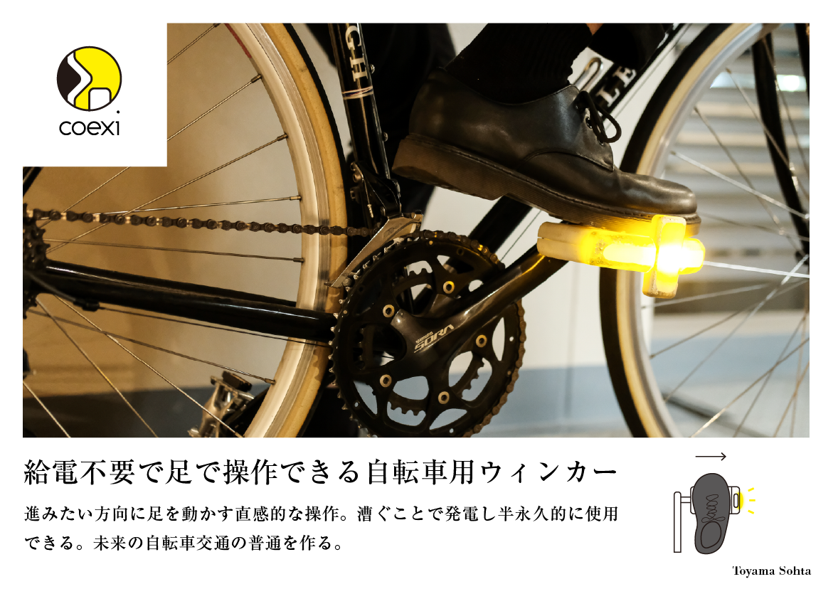 未来の\\"交通\\"のふつうを作る、自転車のペダル一体型のウィンカー。発電機構が組み込まれていて一度取り付けると半永久的に使える。