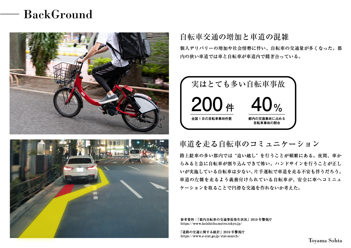 UberEatsなどの個人デリバリーの増加や混雑する電車を使いにくい社会情勢に伴い、自転車の交通量が多くなった。都内の狭い車道では車と自転車が鬩ぎ合っている。車道の左側を走ることを義務付けられている自転車は路上駐車を避ける為、頻繁に車線変更を行うのが現状だ。夜間車から見ると自転車が前触れもなく横入りしてくるのでとても怖い。もっと安全に自転車と車が交通できないものかと考えた。