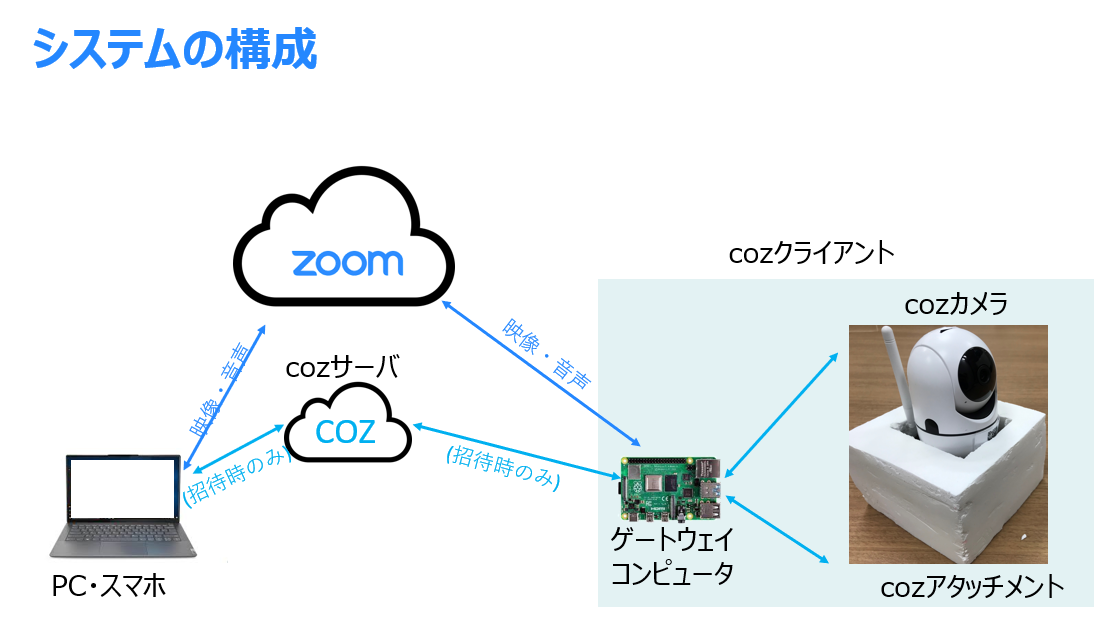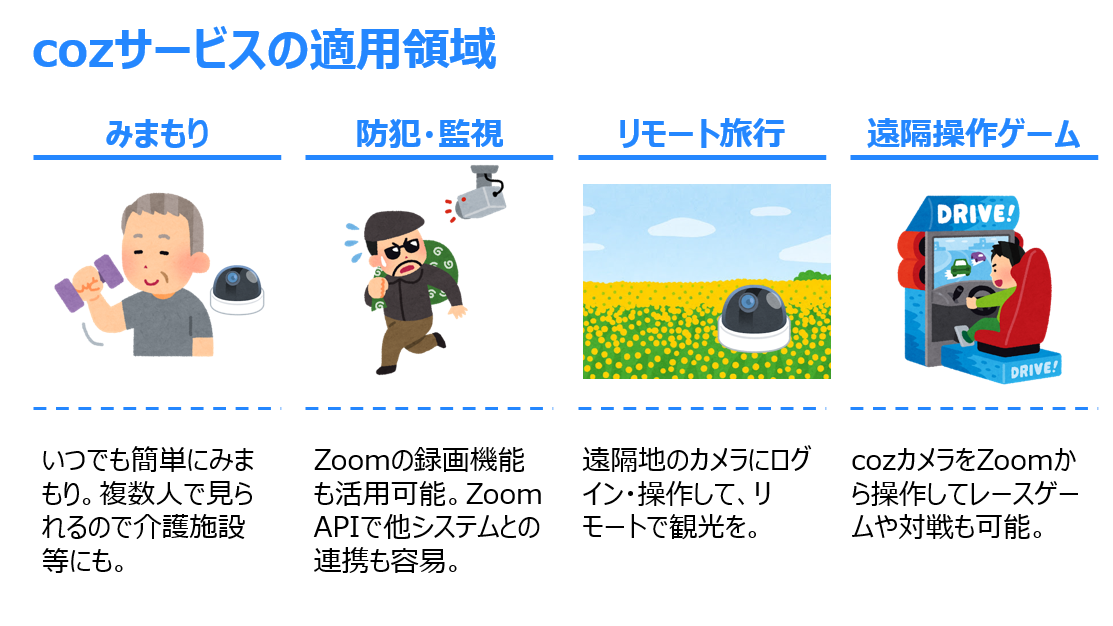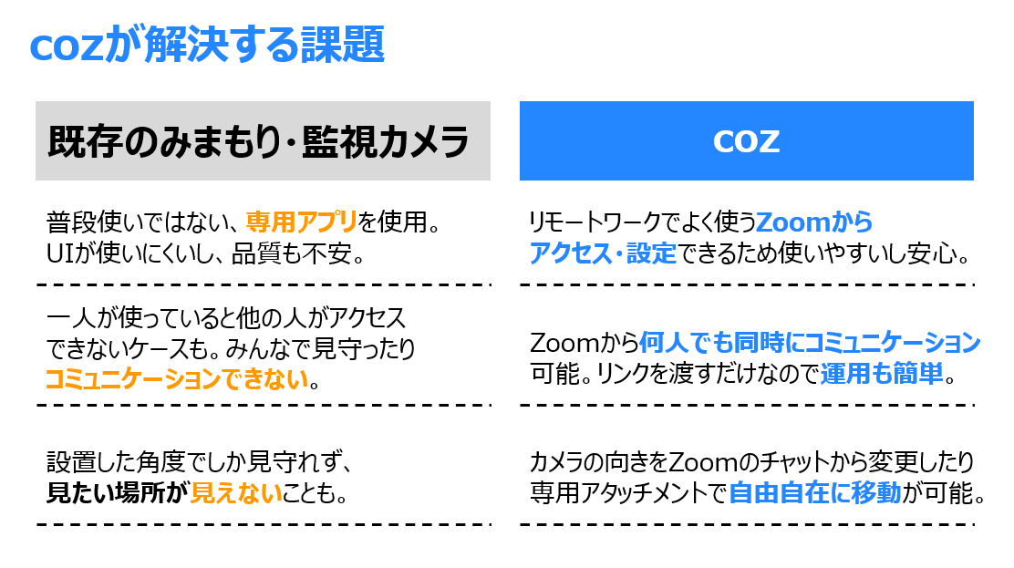 coz(こず)は、専用アプリなしで利用できるコミュニケーションカメラです。Zoomの招待リンクをコピペするだけで開催しているZoom会議にcozカメラを招待することができます。在宅ワークやリモート飲みで使い慣れているUXで簡単に、離れて暮らす家族の見守りや、遠隔地の監視ができます。