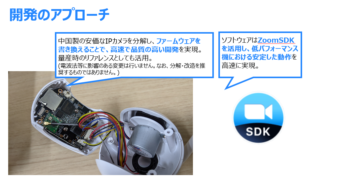 Zoomを使うことで複数人が同時に見守ったり、双方向のコミュニケーションを行うことも簡単にできます。また、Zoomのチャットからカメラに対してメッセージを送ることで、カメラの向きを操作したり、台車(アタッチメント)を操作してカメラ自体を移動させることもできます。
