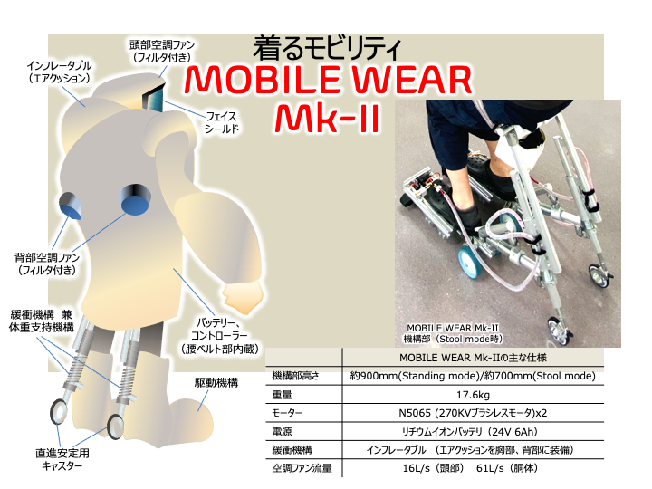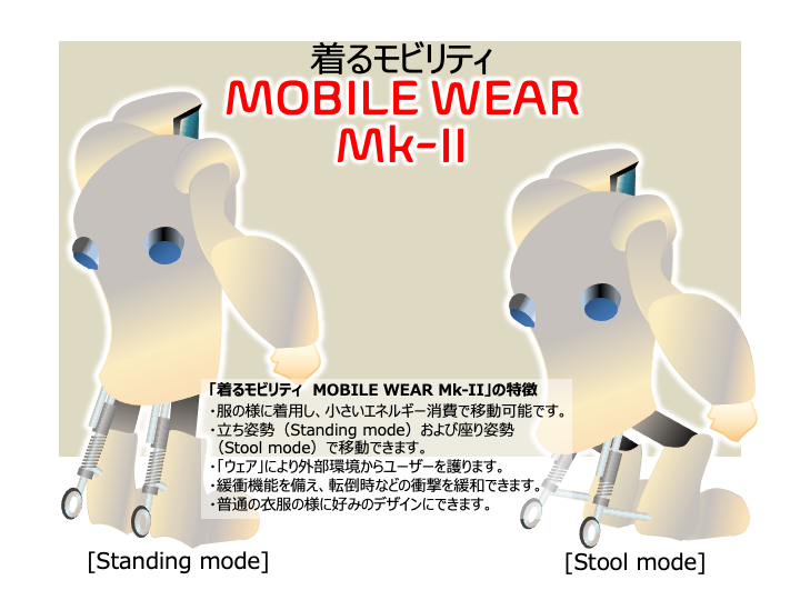 MOBILE WEAR Mk-IIは交通デザイン研究所が提案する新しいパーソナルモビリティ。服の様に着用し、小さなエネルギー消費で立ち姿勢(Standing mode)および座り姿勢(Stool mode)で移動することができます。