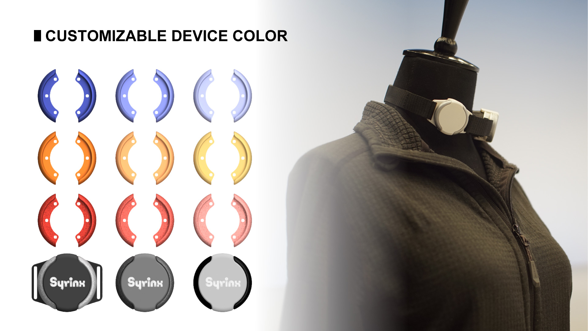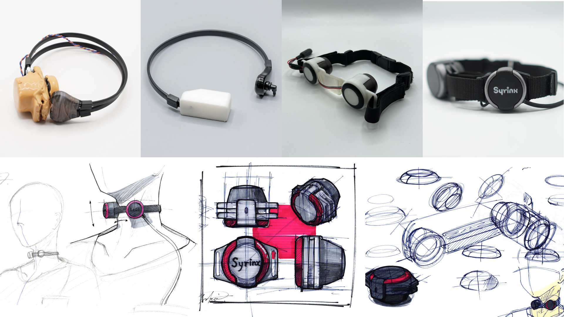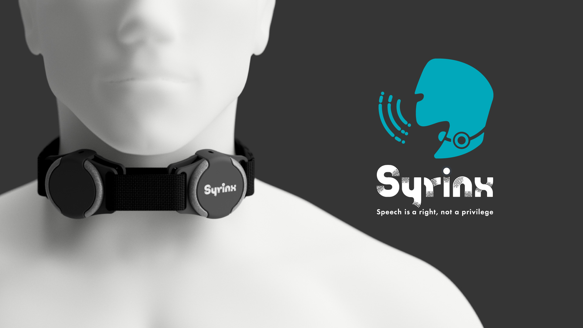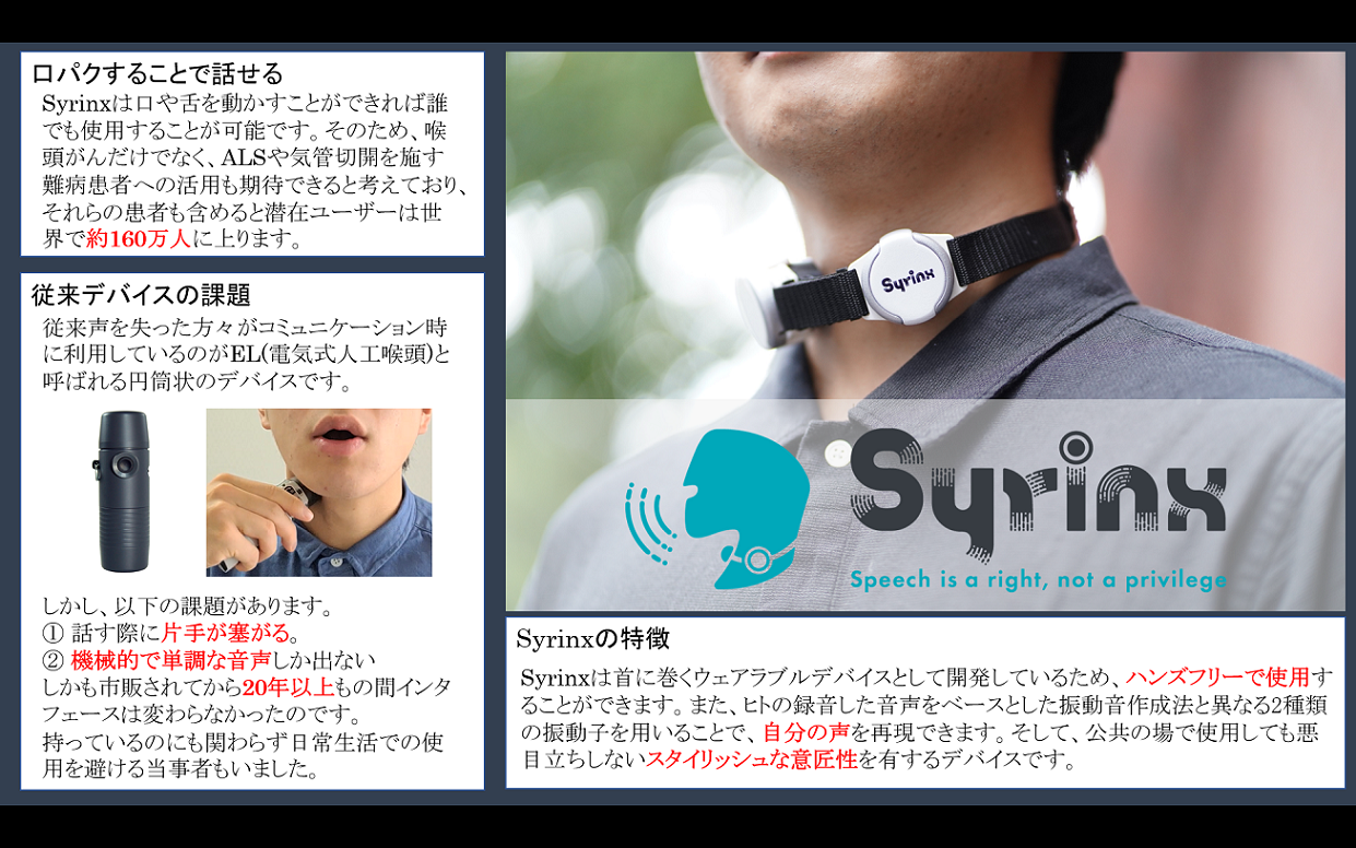 Syrinxは,喉頭がんなどの病気により声帯を摘出して声を失った方が、口パクをするだけでヒトに近い発声を可能にするウェアラブルデバイスです。