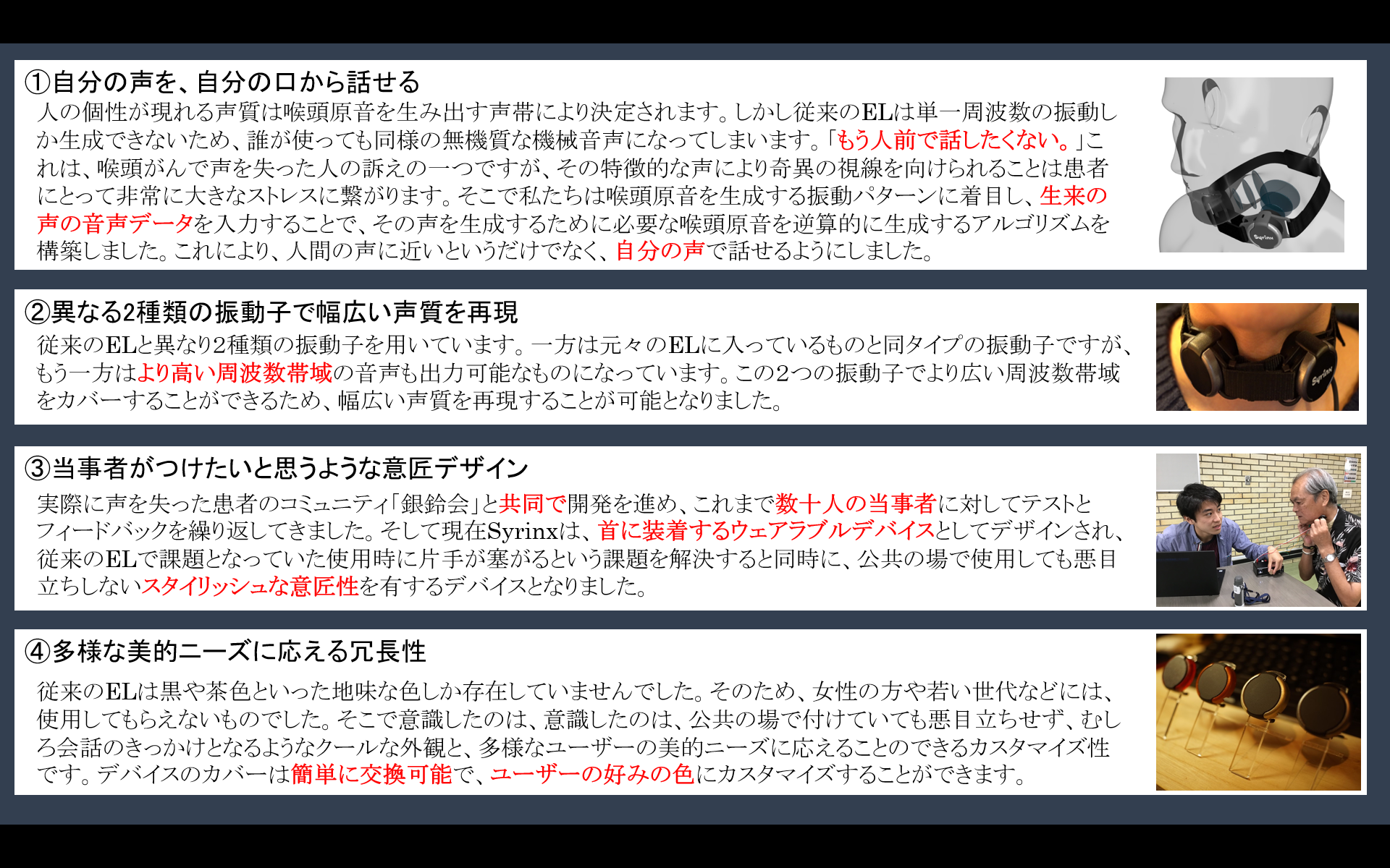また私たちは声帯摘出をして声を失った方々のコミュニティである銀鈴会の方々からフィードバックをいただきながら、開発を進めています。これによりユーザー目線に近いデバイスとしてSyrinxの開発に取り組んでいきます。